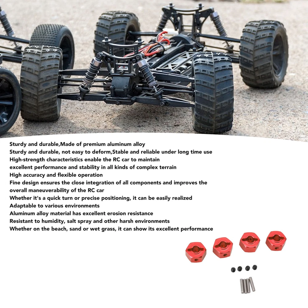 Feature: 1. STRONG AND : Made of premium aluminum alloy, it is strong and , not easy to be deformed, which ensures that the combiner is still stable and under prolonged use. Its high strength characteristics enable the RC car to maintain excellent performance and stability in a variety of complex terrain. 2. HIGH ACCURACY AND FLEXIBLE : The aluminum alloy adaptor is finely designed to ensure a tight fit between all parts, thus improving the overall handling of the RC car. Whether it is fast turning or precise positioning, it can be easily realized, making the driving experience smoother and more comfortable. 3. ADAPT TO VARIOUS ENVIRONMENTS: The aluminum alloy material has excellent erosion resistance, which can effectively resist the erosion of humidity, salt spray and other harsh environments, ensuring that the RC car can work normally in various environments. Whether on the beach, sand or wet grass, it can show its excellent performance. 4. EASY INSTALLATION: The combiner is well designed and the installation process is simple and quick, which can be completed without complicated tools or professional skills. Meanwhile, it is also very easy to maintain, only need regular cleaning and inspection to ensure the continuous and stable of the RC car. 5. ENHANCE THE OVERALL PERFORMANCE: The application of 12mm aluminum alloy adaptor not only enhances the structural strength and stability of the RC car, but also optimizes its power transmission efficiency, making the acceleration, braking and steering of the RC car more rapid and sensitive. Specification: Item Type: RC Wheel Hex Hub Adaptor Material: Aluminum Alloy Size: Diameter: Approx. 12mm/0.47in Thickness: Approx. 7mm/0.28in Application: for 1/10 1/12 1/14 RC Car Package List: 4 x RC Wheel Hex Hub Adaptor 4 x Pin 4 x Screws Note: Manual measurement please allow some error.