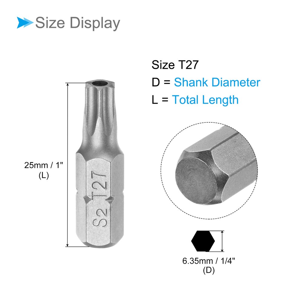 Document Attributes:* Shank Size: 1/4"* Total Length: 25mm / 1"* Bit Type: T27 * Material: S2 SteelWhat Is Included:* 4 Piece x Torx Screwdriver BitApplications & Features:--- Those bits fit for electric screwdrivers, hand screwdrivers, electric drills, air drills, air batches and 1/4" screwdriver sets.--- The torx screwdriver bits are made of S2 steel, which ensures high hardness, durability and wear resistance.--- These screwdriver bits are magnetic, which can firmly absorb the screw to prevent it from falling off.--- The star head bits are easy to install on the screwdriver handle with double ear on the sides of the bit shank.Useful Tips:--- Please apply appropriate force. Excessive force may cause the bit to slip, while insufficient force may not effectively tighten or remove the screw. 4pcs Torx Screwdriver Bits 1/4" Hex Shank 25mm T27 Magnetic Screwdrivers Bit Attributes: * Shank Size: 1/4" * Total Length: 25mm / 1" * Bit Type: T27 * Material: S2 Steel What Is Included: * 4 Piece x Torx Screwdriver Bit Applications & Features: --- Those bits fit for electric screwdrivers, hand screwdrivers, electric drills, air drills, air batches and 1/4" screwdriver sets. --- The torx screwdriver bits are made of S2 steel, which ensures high hardness, durability and wear resistance. --- These screwdriver bits are magnetic, which can firmly absorb the screw to prevent it from falling off. --- The star head bits are easy to install on the screwdriver handle with double ear on the sides of the bit shank. Useful Tips: --- Please apply appropriate force. Excessive force may cause the bit to slip, while insufficient force may not effectively tighten or remove the screw. Hot Item Payment 1.We accept eBay payment . 2.Payment must be received within 7 business days of auction closing. Shipping 1.We ship to your eBay or Paypal address. Please make sure your eBay and Paypal address is correct before you pay. 2.Items will be shipped within 1-3 business day when we received payment. 3.Delivery time depends on destination and other factors. Description Policy 4pcs Torx Screwdriver Bits 1/4" Hex Shank 25mm T27 Magnetic Screwdrivers Bit Attributes: * Shank Size: 1/4" * Total Length: 25mm / 1" * Bit Type: T27 * Material: S2 Steel What Is Included: * 4 Piece x Torx Screwdriver Bit Applications & Features: --- Those bits fit for electric screwdrivers, hand screwdrivers, electric drills, air drills, air batches and 1/4" screwdriver sets. --- The torx screwdriver bits are made of S2 steel, which ensures high hardness, durability and wear resistance. --- These screwdriver bits are magnetic, which can firmly absorb the screw to prevent it from falling off. --- The star head bits are easy to install on the screwdriver handle with double ear on the sides of the bit shank. Useful Tips: --- Please apply appropriate force. Excessive force may cause the bit to slip, while insufficient force may not effectively tighten or remove the screw. Hot Item Payment 1.We accept eBay payment . 2.Payment must be received within 7 business days of auction closing. Shipping 1.We ship to your eBay or Paypal address. Please make sure your eBay and Paypal address is correct before you pay. 2.Items will be shipped within 1-3 business day when we received payment. 3.Delivery time depends on destination and other factors.