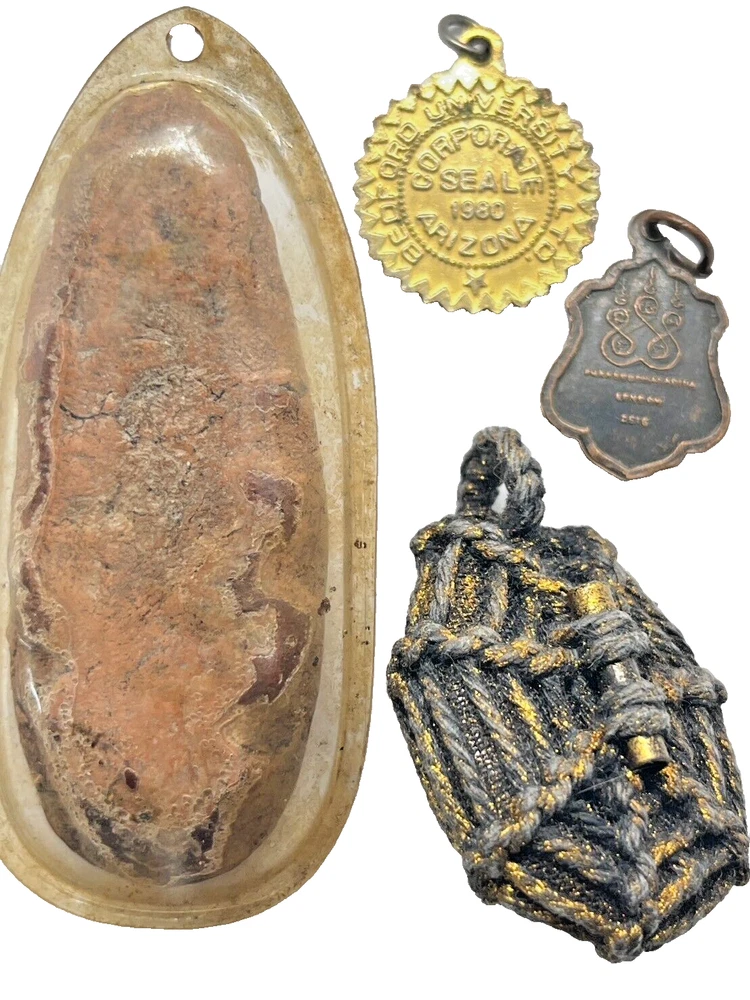 4pcs Thai AMULET Coin Shell Buddha Monk Antique CHARM Pendant Collectible Rare This listing features a 4pcs Thai Amulet set , including a clay Buddha amulet, a monk coin, a metal Buddha pendant, and a beautifully wrapped shell talisman. These rare and unique items are deeply rooted in Thai Buddhist culture, symbolizing protection, good luck, and spiritual guidance. Each piece is handcrafted and reflects the sacred artistry and tradition of Thailand. The clay Buddha amulet and the coin feature intricate details, while the shell is polished and wrapped with care. Perfect for collectors of Buddhist antiques, spiritual practitioners, or those seeking meaningful talismans. In excellent vintage condition, this set is ideal for display, gifting, or use in meditation and rituals. The pieces show minor wear and patina consistent with age, which enhances their authenticity and charm. Whether you're searching for Thai Buddha amulets , monk coins , or a sacred talisman set , this collection offers a unique opportunity to own rare, handcrafted items from Thailand. Don’t miss out on this collectible set that embodies spirituality and tradition! FREE!! Shipping registered mail WORLDWIDE with tracking number. If you have questions, feel free to write me on e B a y message. THANK YOU FOR SHOPPING