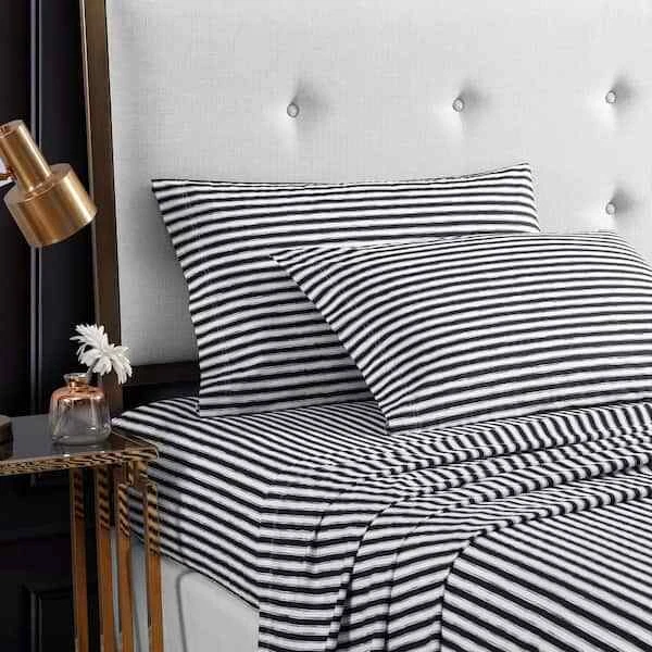 The Betsey Johnson sketchy stripe sheeting features a play on classic striping in a whimsical Betsey manner combining a bold black with white. Add some fun with Betsey's cotton percale sheet set. Available in an array of additional designs, these 200 thread count sheets will add an extra layer that is cool to the touch. Breathable and lightweight, this cotton construction is perfect for long-lasting comfort. Each sheet set includes one flat sheet, one fitted sheet, and two pillowcases (one for twin and twinxl sizes). The fully elasticized fitted sheet prevents slipping from the mattress and ensures the perfect fit. This set fits mattresses up to 18" deep (16" deep for twin/twinxl size and 17" deep for full size). This set is machine washable for easy care.