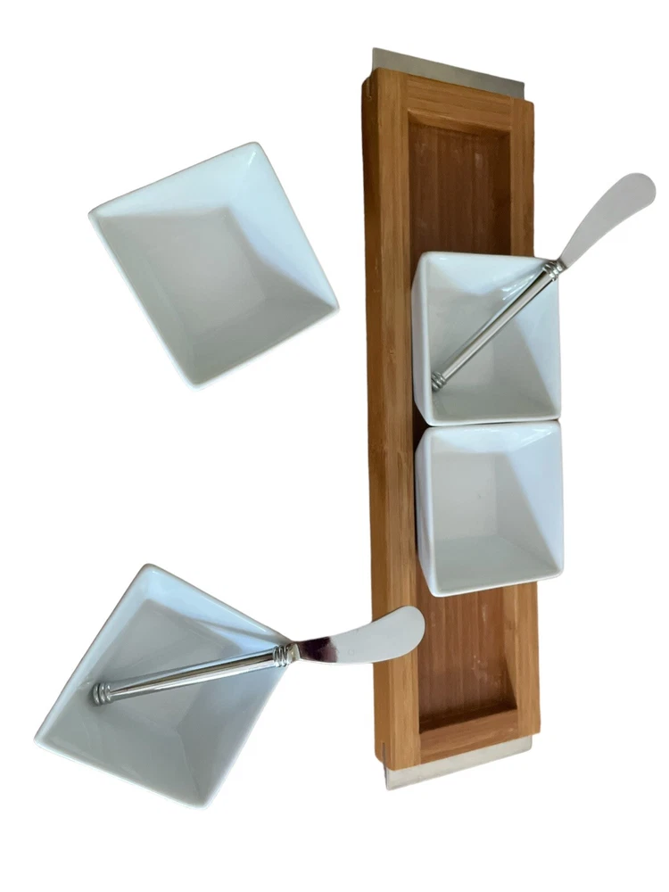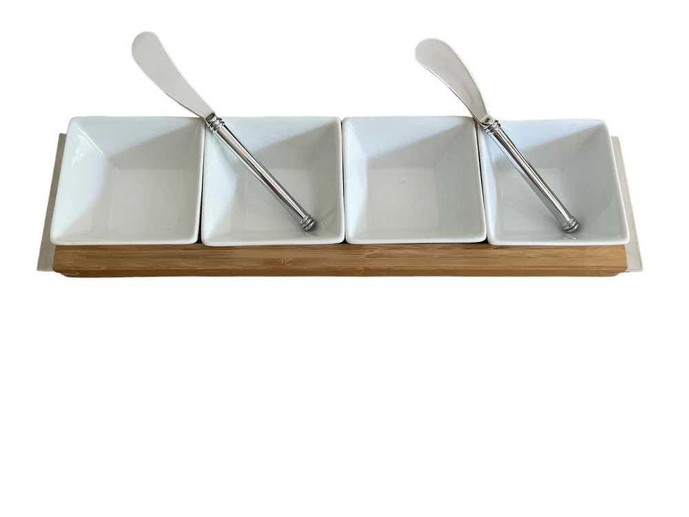 Add a touch of elegance to your dining table with this 4-piece condiment set. The set includes four serving square bowls and one bamboo serving tray. The square shape of the bowls and rectangular tray along with two small butter knives make them a perfect fit for any table setting. Crafted from high-quality glass and bamboo materials, this set is both durable and stylish. Use it to serve your favorite condiments and enhance your dining experience. Perfect for any occasion, this condiment set is a must-have addition to your kitchen collection. The pictures shown are the actual item you will receive. Please check photos carefully as they are the best description.