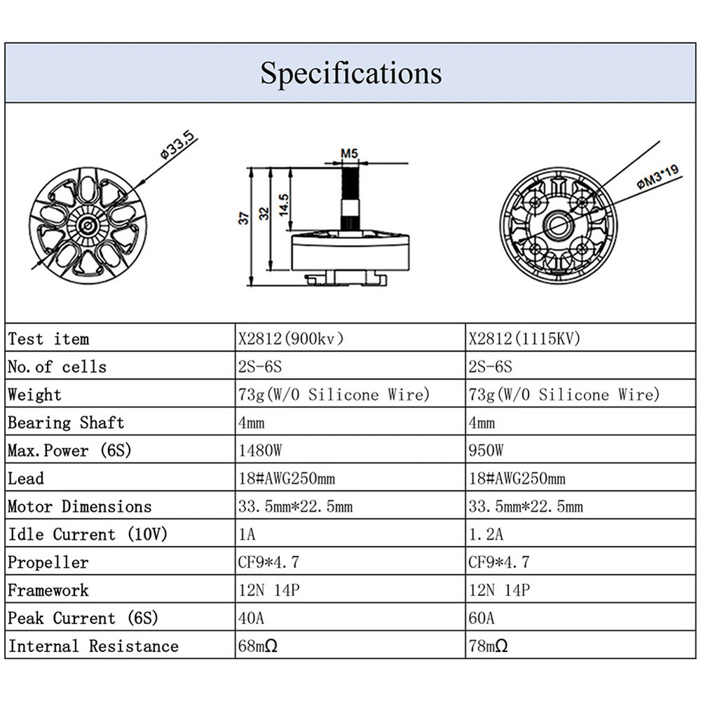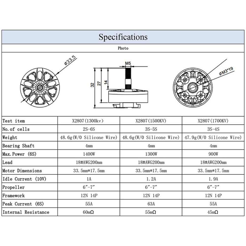 You may also like Universal Front/Rear CVD Drive Shaft For 1/10 ECX 2WD Circuit Ruckus Torment RC 20.07 USD Free shipping 10PCS M3 CNC Round Aluminum Alloy Flat Spacer Washer Screw Gasket For RC 5.52 USD Free shipping 10~100Pcs M3 Color Aluminum Column Round Alloy Lightweight Standoff Spacer Stud 10.25 USD Free shipping Metal Upgrades Parts Kit for WLtoys 144001 124018 124019 Toy Rc car Replacement 26.59 USD Free shipping 40-42mm Motor Heatsink with Dual Cooling Fan for 4268 4274 1/8 1/10 RC Motor 19.28 USD Free shipping For Axial SCX6 1/6 RC Crawler Truck Adjustable Metal Tow Trailer Hitch Bracket 26.12 USD Free shipping 4Pcs RC Car Wrench 3/3.2/3.5/3.7/4/5/5.5/6mm Turnbuckle Ball End Joint Remover 17.76 USD Free shipping RC Motor Fan Cooling Heatsink for 540 550 3650 3660 Brushless Motor 8.4V New 14.91 USD Free shipping Aluminum Front Rear Chassis Brace Tower 9520 9521 For 1/8 Traxxas SLEDGE 95076 57.18 USD Free shipping Front + Rear Diff GearBox for Traxxas 1/10 Rustler Hoss Slash Stampede 4x4 VXL 27.83 USD Free shipping NEW For 1/10 RC Crawler Car 32P 3.17mm RC Car Motor Gear Pinion 11T - 20T Parts 10.16 USD Free shipping Full Set Aluminum Alloy RC Upgrades Parts For LOSI 1/10 LASERNUT ULTRA4 U4 16.5 USD Free shipping Features: 1. X2807/X2812 brushless motor is the upgraded motor, 12N14P high torque motor design, which is smooth, reliable and powerful. 2. The motor is characterized by support 2~6S lipo. Suitable for multicopter, RC aircraft, drone. 3. X2807 Motor KV 1300/1500/1700KV & , shaft size 4 x 14mm, motor mount M3*19, which is compatible with 6-7inch propeller. X2812 Motor KV 900/1115KV, shaft size 4 x 14.5mm, motor mount M3*19, which is compatible with CF9*4.7 propeller. 4. FPV brushless motor provides the most incredible power and thrust in the lightest weight. Give you a more satisfied experience with your model. 5. Each rotor was dynamically balanced with high speed. High purity copper windings maximize efficiency, good insulation and heat resistance. Descriptions: This X2807 1300/1500/1700KV X2812 900/1115KV brushless motor, support 2-6s lipo battery, more powerful and better faster. Featuring 12N14P high torque design, strong thrust, more powerful than other ordinary brushless motors, high working efficiency. Widely use in RC aircraft, drone, helicopter, plane, multicopter and so on. Specifications: Model: X2807 Framework: 12N 14P No. of Cells: 2-6S Length: 32mm Shaft: M3 KV: 1300/1500/1700 (optional) Diameter: 33.5mm Propeller Suggested: 6-7inch Weight: 50g Model: X2812 Framework: 12N 14P No. of Cells: 2-6S Length: 37mm Shaft: M5 KV: 900/1115KV (optional) Diameter: 33.5mm Propeller Suggested: CF9*4.7 Net Weight: 72g Pakcage Included: 1-4 x Brushless Motors 1-4 x x Screws