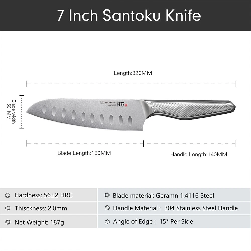 UPC: Does not apply Handle Material: 304 Stainless Steel gtin13: Does not apply Making Method: Hot Air Blade Length: 7in,9in, 9in Manufacturer Warranty: Lifetime Handness: 56HRC Features: Easy Clean, Well Balance, With Gift Box Blade Edge: Straight Set Includes: Knife Set Bundle Description: 3x Knife & 1x Knife Block in Gift Box Brand: TURWHO Color: Silver Cutting edge: 15 degrees Number of Items in Set: 4 Material: German Steel MPN: Does not apply Food Compatibility: Universal Custom Bundle: Yes Room: Kitchen Type: Knife Set