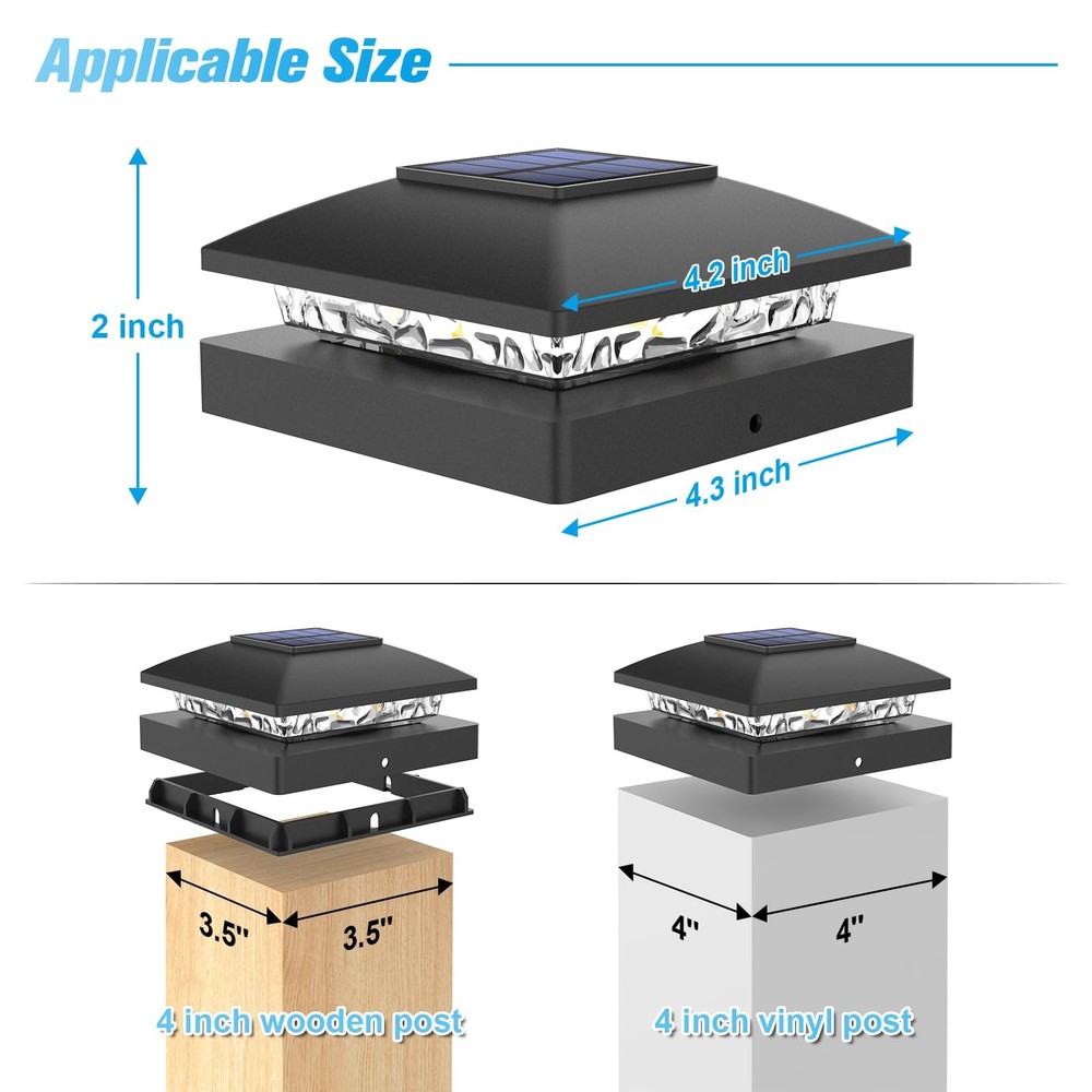 【Product size】The most important point: solar post cap light is a small-sized light - please check the size of your posts first. If you are unsure of any doubts about the size, you can first confirm with our after-sales team. We are very happy to answer your questions! The height of the 4x4 solar post cap light is 2inch/5cm. the length of 4x4 solar fence post cap light is 4.3in/11cm, the width of 4x4 solar deck post cap light is 4.3in/11cm. 【Fit for post size】Our 4x4 solar deck post cap lights come in various sizes. It is suitable for 4x4 wooden post, 4x4 vinyl post. It can illuminating fences, decks, mailaboxes, making them a versatile and stylish addition to any outdoor space. 【IP64 waterproof】4x4 vinyl fence post solar lights have been upgraded with IP64 waterproof material, which it can withstand high temperature heat, pouring rain, snowstorm or any other outdoor environments. These 4x4 post cap of vinyl fence post cap lights protect your post from rain and sun to prevent premature rotting! 【Easy Installation】Each package contains 2 bases (4x4 wooden post and 4x4 vinyl post) and 12 screws. Choose the appropriate base size and place it on the corresponding post, then screw the two screws into the post through the small holes on both sides of the base. The solar fence post cap light is charged in sunlight for 6-8 hours during the day and automatically turns on for 10-12 hours at night. 【100% Satisfaction Service】We proudly stand behind all of our products 100% and offer a full 2-year service for our outdoor post lighting. This will cover you if the lights stop working or there are any defects within those 2 years.(If you have any question of our products, please feel free to our support team.)