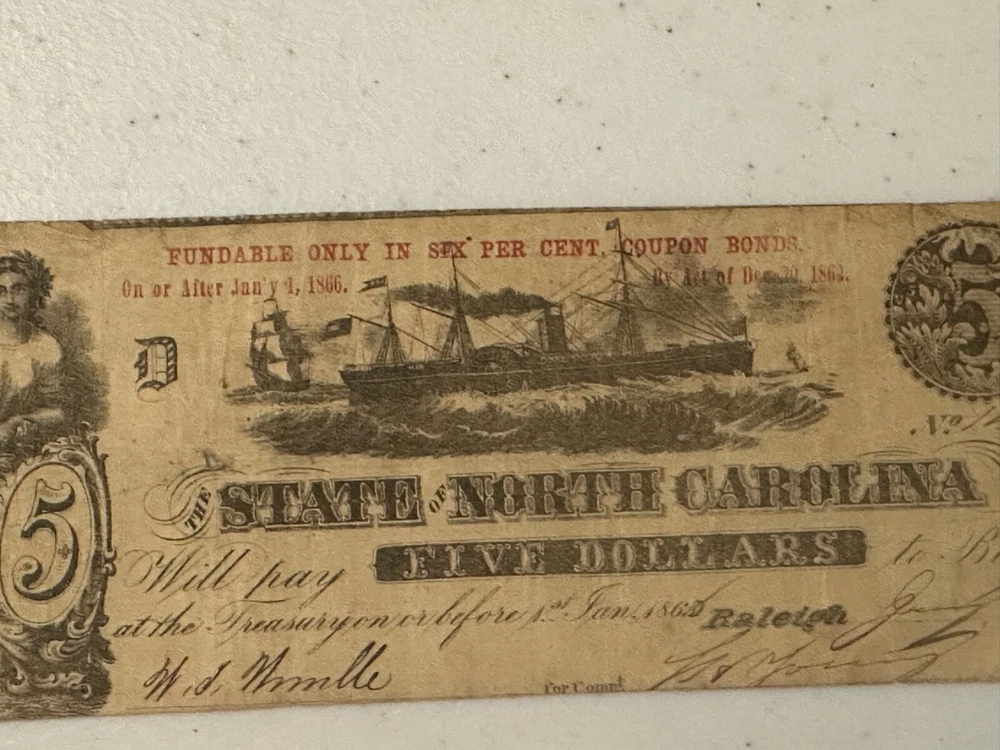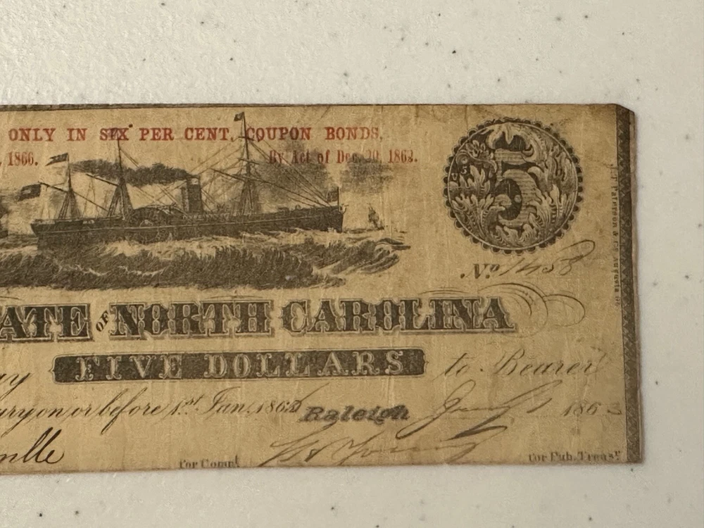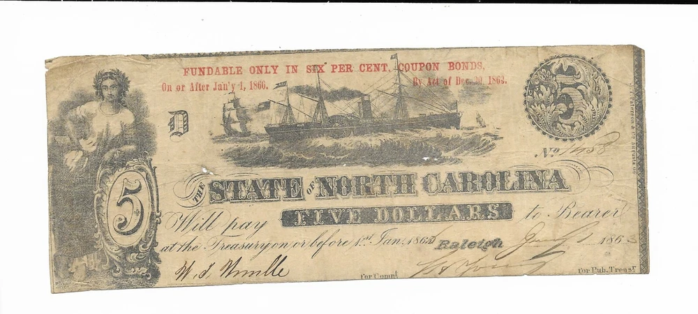 $5 1863 Raleigh North Carolina Red Fundable ONLY CR124B Serial #1458