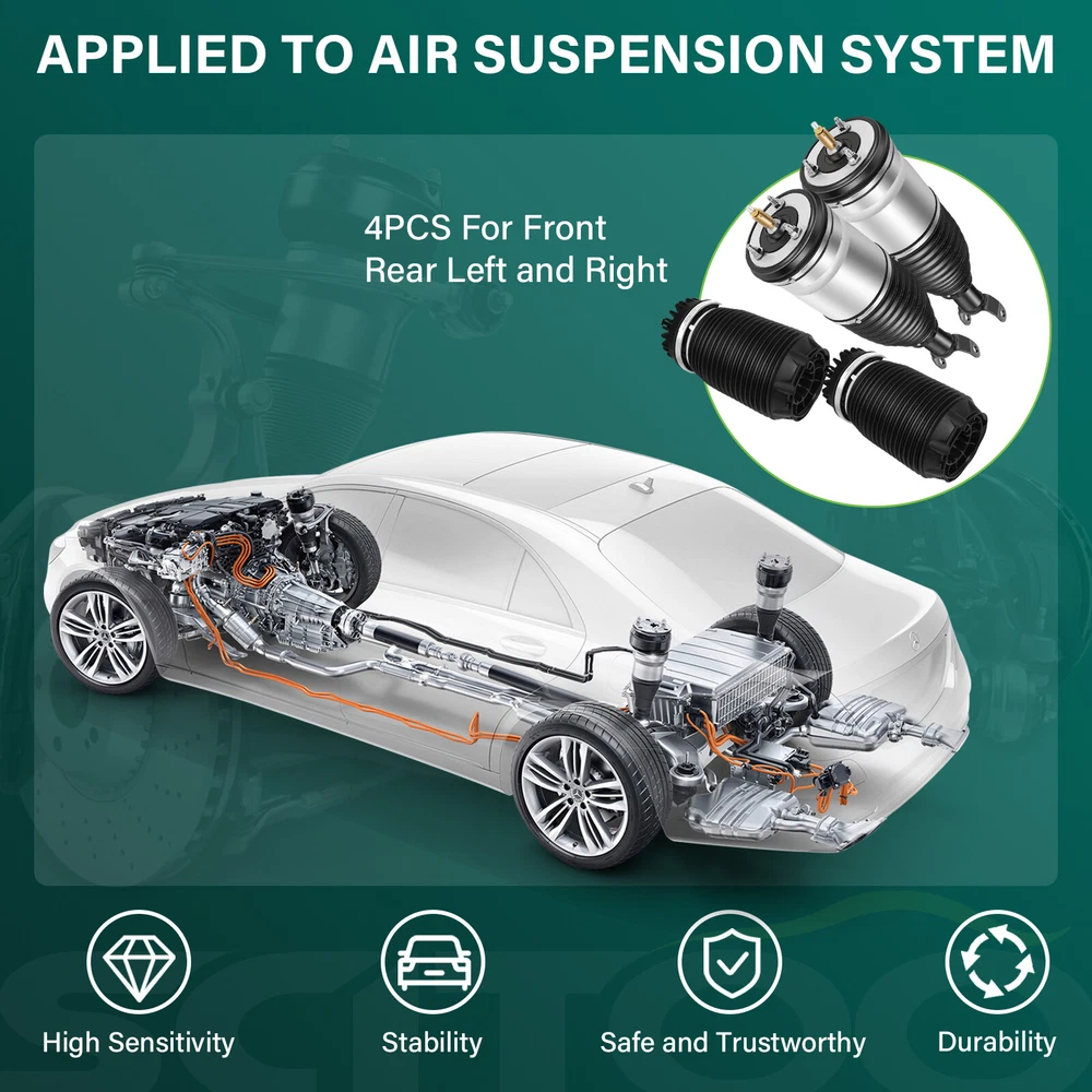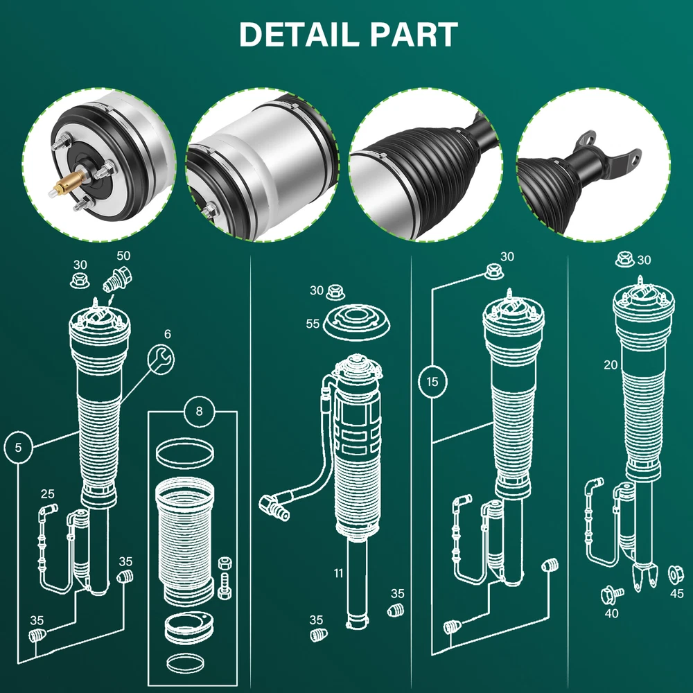 *Compatibility Chart 1, You can distinguish specific model of an automobile by VIN(Vehicle Identification Number). 2, VIN(Vehicle Identification Number) consists of total 17 English letters and arabic digits. 3, VIN does not include the letters I (i), O (o), and Q (q) (to avoid confusion with numerals 1 and 0). Dodge RAM 1500 2013-2018 *OEM Part Number: Front Air Suspension Strut: 04877147AF,04877147AC,04877147AG,04877147AD,04877147AB Rear Air Suspension Spring:4877136AA,4877136AB,04877136AA,04877136AB,68248948AA 5 Air Suspension Spring Shock Compressor Assembly Fits Ram 1500 13-19 Cab Pickup *Compatibility Chart 1, You can distinguish specific model of an automobile by VIN(Vehicle Identification Number). 2, VIN(Vehicle Identification Number) consists of total 17 English letters and arabic digits. 3, VIN does not include the letters I (i), O (o), and Q (q) (to avoid confusion with numerals 1 and 0). Dodge RAM 1500 2013-2018 *OEM Part Number: Front Air Suspension Strut: 04877147AF,04877147AC, 04877147AG,04877147AD, 04877147AB Rear Air Suspension Spring: 4877136AA,4877136AB,04877136AA,04877136AB,68248948AA Air Suspension Compressor: 68041137, 68204730, 68041137AF, 68041137AC, 68041137AD, 68041137AE, 68041137AF, 68041137AG, 68204730AB, 68204730AC, 68204730AD, 68204730AE, 68204730AF, 68204730AG, 68232648AA *Item Specifications: Key Words: 5 PCS Front Air Suspension Shock Strut & Rear Air Suspension Spring Compressor For Dodge Ram 1500 Limited Rebel 2013-2019 Package Includes: 2 PCS Front Air Suspension Shock Strut & 2 PCS Rear Air Suspension Spring & Air Suspension Compressor Notes : Please double confirm the compatibility as well as the OEM number before purchasing. Instruction is not included. Professional installation is recommended. * Generation & Evolution: Dodge Ram Pickup First generation(1981-1993) D/W Second generation(1994-2002) BR/BE Third generation(2002-2009) DR/DH/D1/DC/DM Fourth generation(2009-present) DS/DJ/D2 Fifth generation(2019-present) DT *Removal Guideline: Caution: Damage to the vehicle and air suspension system can be incurred if work is carried out in a manner other than specified in the instructions or in a different sequence. To avoid the possibility of short circuits while working with electric components consult your owner's manual on how to disconnect your battery. Consult your vehicle owner's manual, service manual, or car dealer for the correct jacking points on your vehicle and for additional care, safety and maintenance instructions. Under no circumstances should any work be completed underneath the vehicle if it is not adequately supported, as serious injuries and death can occur. 1.Set steering to straight ahead. 2.Raise vehicle. 3.Remove applicable front wheel.(picture 1) 4.Loosen and remove the tie rod end nut.(picture 2) 5.Loose and remove the two sway bar end link nuts.(picture 3,4) 6.Loosen and remove the upper control arm nut.(picture 5) 7.Loosen and remove the nut and bolt from the bottom strut fork.(picture 6) 8.Loosen and remove the air fitting from the top of the strut.(picture 7) 9.Loosen and remove the three top strut mounting nuts.(picture 8) 10.Remove the strut.(picture 9) 11.Removal complete. *Installation Guideline: 12.Install the new strut into the vehicle.(picture 10) 13.Install the three top strut mounting nuts and tighten to manufacturer's specifications.(picture 11) 14.Remove the white shipping pin from the air strut and discard.(picture 12) 15.Remove the existing air line elbow, and then install the new elbow onto the air line.(pictures 13,14) 16.Install the air line until fully seated, pulling outward slightly to confirm engagement.(pictures 15,16) 17.Install the upper control arm nut and tighten to manufacturer's specifications.(picture 17) 18.Reinstall the strut's bottom nut and bolt and tighten to manufacturer's specifications. 19.Reinstall and tighten the two sway bar end link nuts to manufacturer's specifications. 20.Reinstall the tie rod end nut and tighten to manufacturer's specifications. 21.Re-install applicable front wheel. 22.Lower vehicle. 23.Installation complete. * Frequently Asked Questions : How to prevent the damage of air springs/How to extend the service life of air springs/struts etc.? An air strut with separable air springs If your vehicle offers a separable air suspension (Audi Allroad A6 C5, Mercedes-Benz W164, BMW X5, etc.), you should regularly (about once a week) lift the car to the maximum position, and remove dirt with a high-pressure cleaner (keep the cleaner at a distance to the air spring about 30 cm/12 inches, otherwise water pressure can damage the air spring). The highest position may vary depending on your model and regulation options. Therefore, please test this by trying the different modes available to you (Sport, comfort, dynamic, off-road) and choose the one that sets your vehicle to the highest position. The dirt will most likely be found under the fold of the pneumatic chambers. If you find a frozen layer of bitumen on the piston guide (the part of a strut on which the air spring is installed), it is recommended to clean it as well. Whenever possible, avoid riding on fresh asphalt, as fresh bitumen mixed with sand immediately results in a build-up of abrasives on the piston and in turn contributes to accelerated wear and tear of the air spring. A complete air suspension shock Many cars such as Mercedes W220 or W211 are set up with a complete air strut - shock absorber and air spring visually form a complete spare part. In many cases, you can easily recognize these by the metal cups with which the air spring is tightly mounted. To best avoid any damage, we highly recommend to regularly check the condition of the dust protection seals of the air strut. What is the difference between an air spring and an air strut? The air spring is a part of the air strut. Some vehicles (e.g. Mercedes ML) allow you to change the air spring separately. At our online shop you have the opportunity to buy either t