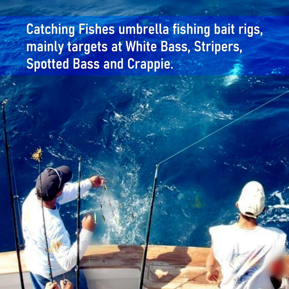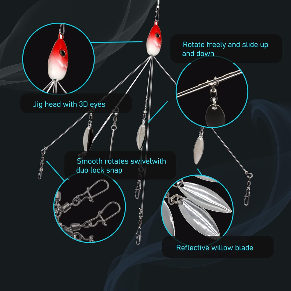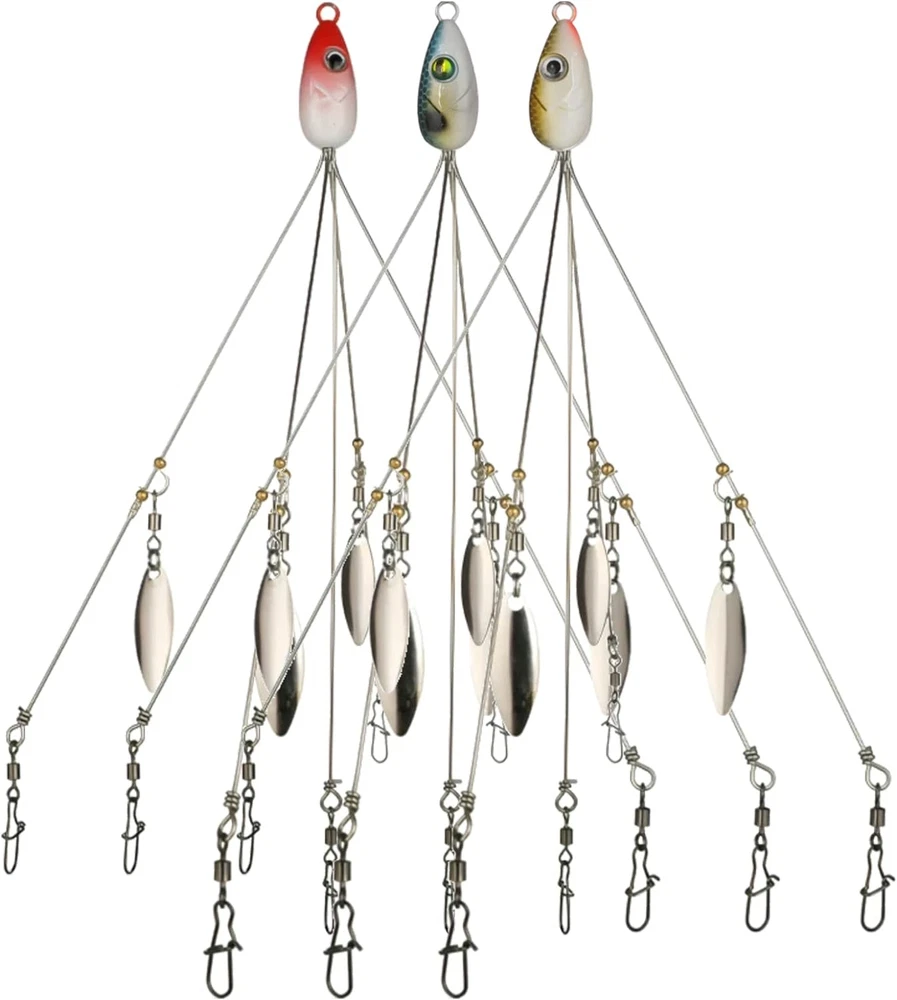 【Package Includes】: 1 Red, 1 Yellow and 1 Blue. Length: 21.5 cm (8.46 in); Weight: 17 g (0.6 oz). This Alabama rig allows anglers to cast multiple baits at once. It is the best partner for giant bass. 【Well Made】: Made with high-quality swivel ring, the spoon can spin freely to catch bass over 10 lbs; smooth running ball bearings and clevis help the 4 bright shimmering willow leaves spin freely for more sparkle And vibrations attract target fish from a distance. 【Suitable for Multiple Soft Baits】: 5 sturdy steel arms ensure strength and flexibility. Sinkerless product with blades. High-quality snaps and swivels allow for easy rigging with a variety of lures. 【Widely Used】: Perfect for both saltwater and freshwater, no matter you are fishing in lake, river, sea, boat, this bait set will help you get great catch. 【Target Fish】: Widely used for catching channel bass, striped bass, yellow perch, walleye, pike, muskfish, roach, largemouth or smallmouth trout, snook, salmon and more. Product Description Quantity: 3pc(red+yellow+blue) Style: 4 blades Length: 8.46 inches Weight: 0.6 ounces Quantity: 2pc(purple+blue) Style: 8 blades Length: 8.8 inches Weight: 0.77 ounces