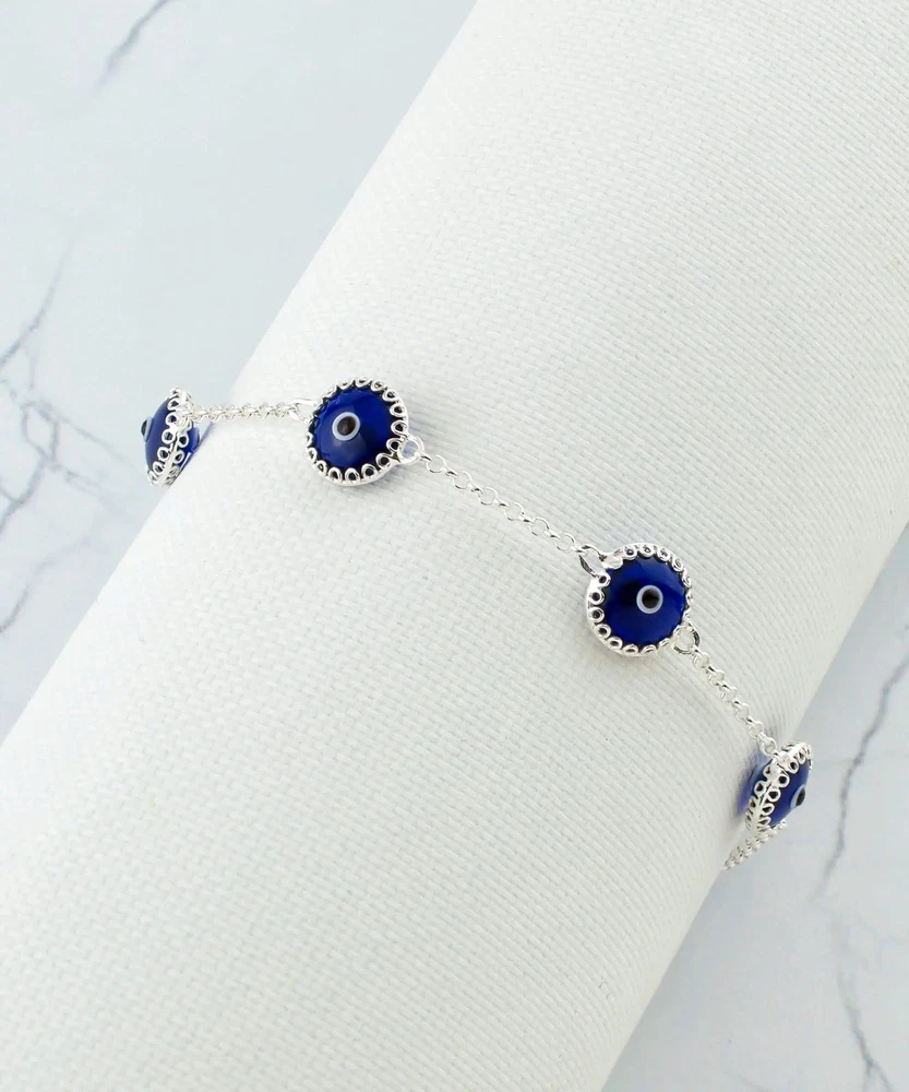 Sterling Silver Dark Blue Evil Eye Women Link Bracelet Designed by our artisan, strong rolo chain, each 5 bead is wrapped by silver 17 prongs from front and back side. The Evil Eye is a powerful amulet that has been used for centuries. It wards off the "Evil Eye" and protects you from bad luck, envy, and gossip. Measure for all bracelets is approximately 0.45" width, the length is 7.00" and it has 2.00" extension. Total length is 9.00". Easy adjustable for your wrist. Bracelet weight is 4.40 gr / 0.15 oz. Secured with lobster claw clasp. Comes with a free velvet pouch and a gift box.