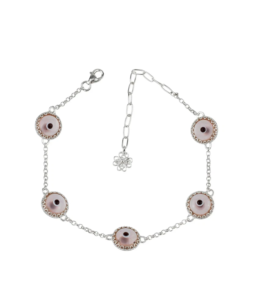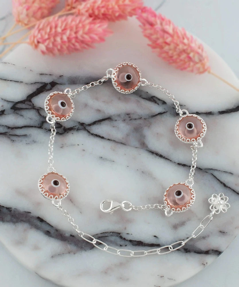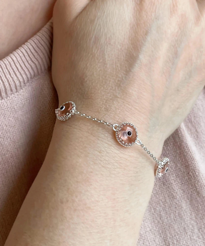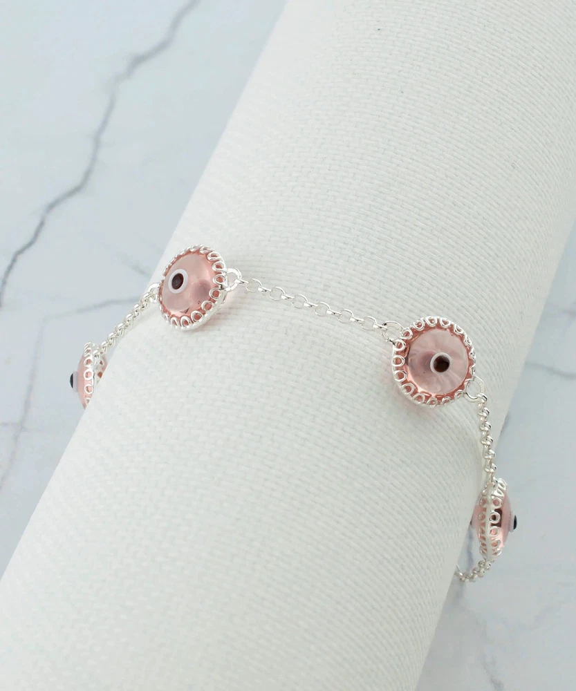 5 Beads Pink Evil Eye Women Silver Link Bracelet