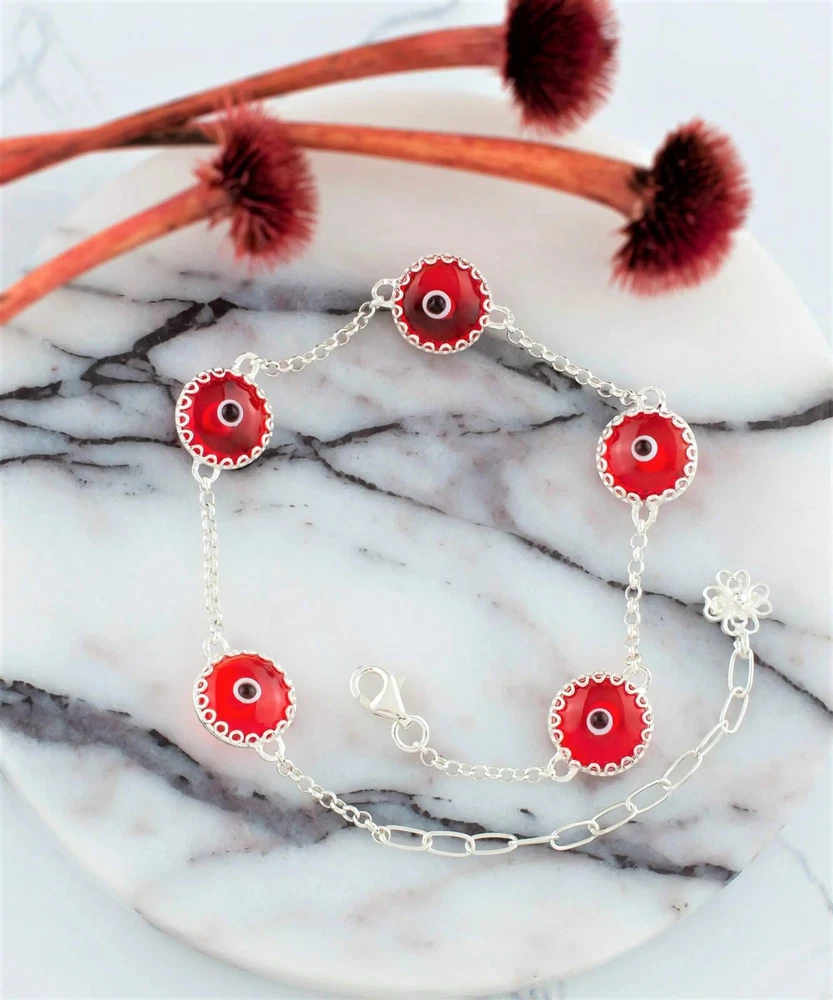 5 Beads Scarlet Evil Eye Women Silver Link Bracelet