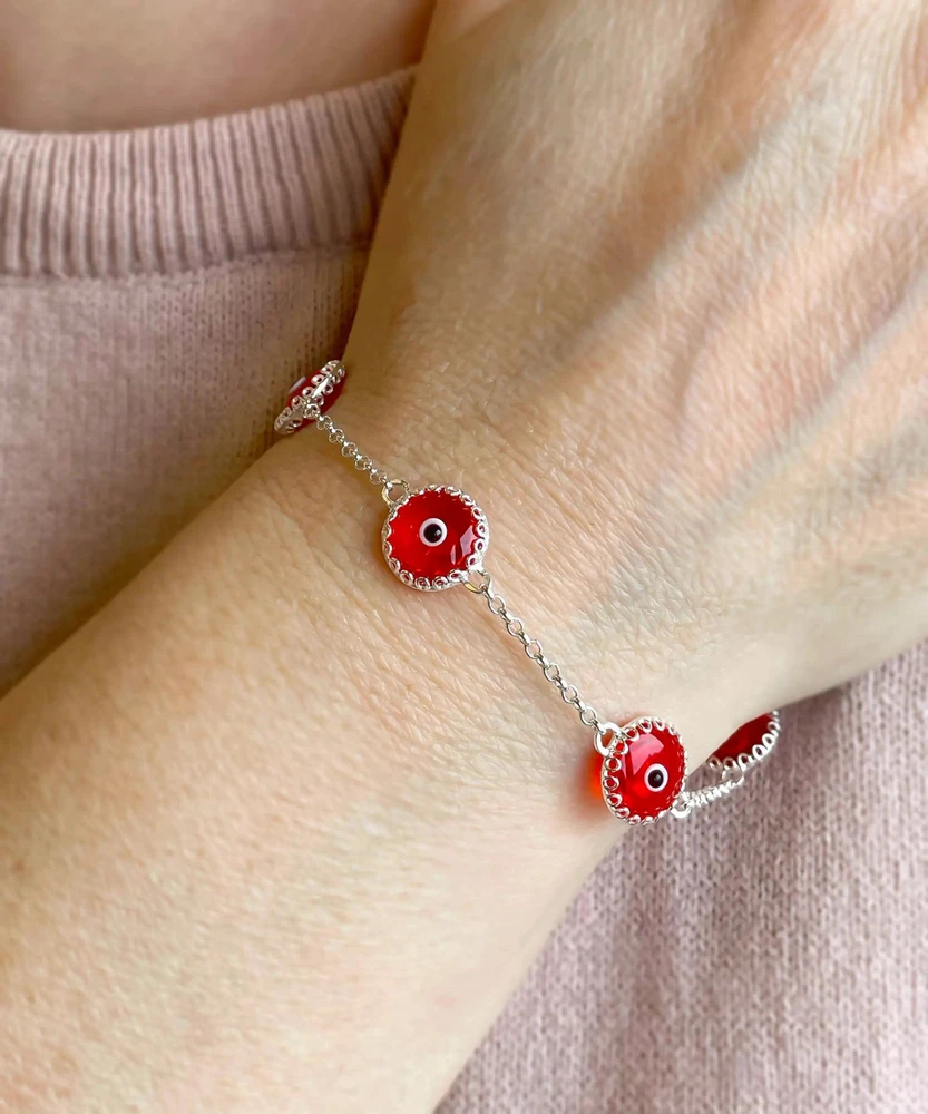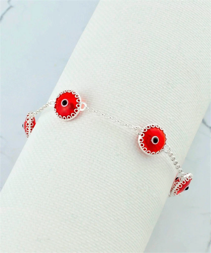 Introducing our stunning scarlet red evil eye bracelet, featuring 5 beads of exquisite Murano glass and crafted with the highest quality sterling silver. Our skilled artisan has designed this women's link bracelet with a strong rolo chain, ensuring both durability and style. Each of the 5 beads is securely wrapped by 17 silver prongs from the front and back, showcasing the beauty of the Murano glass and adding an extra layer of protection to the evil eye motif. The evil eye is a powerful amulet that has been used for centuries, known to ward off bad luck, envy, and gossip. Measuring approximately 0.45" in width, this bracelet has a length of 7.00" and features a 2.00" extension, resulting in a total length of 9.00". This makes it easy to adjust to your wrist size, ensuring a comfortable and personalized fit. With a weight of just 4.50 gr / 0.15 oz, this bracelet is light and comfortable to wear throughout the day. It is secured with a lobster claw clasp, providing peace of mind that it will stay in place. Add a pop of color and protection to your jewelry collection with our scarlet red evil eye bracelet.