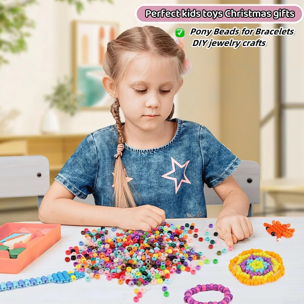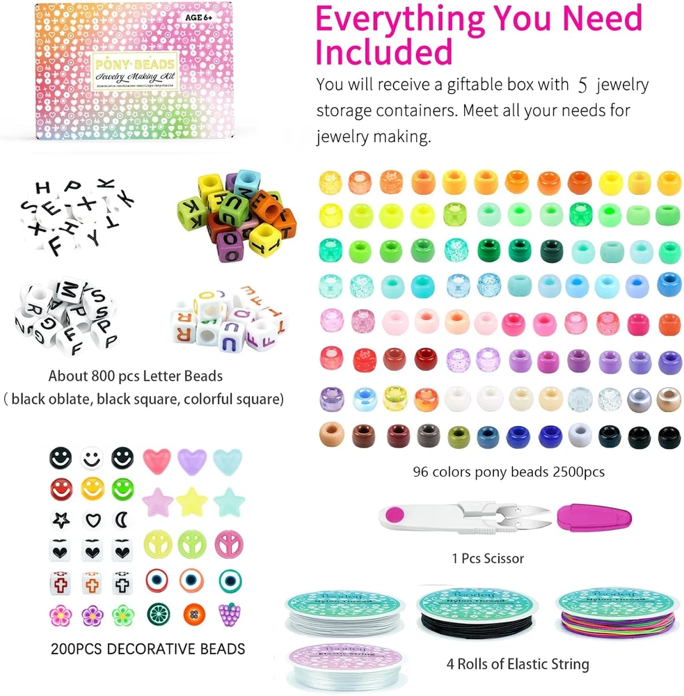 3500 Pieces Bead Kit: you'll receive 2500 pcs pony beads (including 96 vibrancy colors: red, orange, yellow, green, blue, purple, black, solid, pearl, clear, glitter, etc.), 800 pcs alphabet beads, 200 pcs fruit, evil eye, etc decorate beads, 4 rolls elastic strings, scissors and other accessories for all your bracelet and jewelry making needs More Than Just a Bracelet Making Kit!! you can also DIY fun crafts like keychains, hair braids, friendship bracelet, necklaces, frogs, ice cream, turtles, dolphins and other beaded pets! Decorate your backpack, keys and school lanyards. Carry your super cute creations with you wherever you go! Premium Quality: pony beads are 6*9mm in size with 4mm holes.These rainbow color Kandi beads are made of high quality acrylic plastic. Comes with 3 rolls of upgraded braided stretch cord, with adequate stretch and not easy to break compared to ordinary crystal cord . They are non-toxic, durable, uniformly shaped, lightweight, and colorfast, so you can wear them comfortably and confidently even at the beach or poolside! (Suitable for kids age 6+) Ideal Gift: Paodey's pony beads for bracelets comes in a delicate box, making it an ideal gifts or toys for family, lovers, friends. This meaningful gift works great for making festival kandi jewelry to add some cheerful decorations to their lives. A must-have for bracelet making enthusiasts! Perfect for birthdays, Christmas Thanksgiving Day! Fun Learning Tool: craft pony beads can be widely used in classrooms, homes, summer camps or community centers for kids and adults alike. Learning color sorting, counting and weighing, and exercise their attention, creativity and hands-on skills. NOTE! kids should use it under adult supervision and avoid putting it in their mouths out of curiosity Product Description The video showcases the product in use. The video guides you through product setup. The video compares multiple products. The video shows the product being unpacked. 1 Brilliant beads color 2 Happy Parent-child Time 3 Wide variety of beads 4 Beads Crafts for Kids