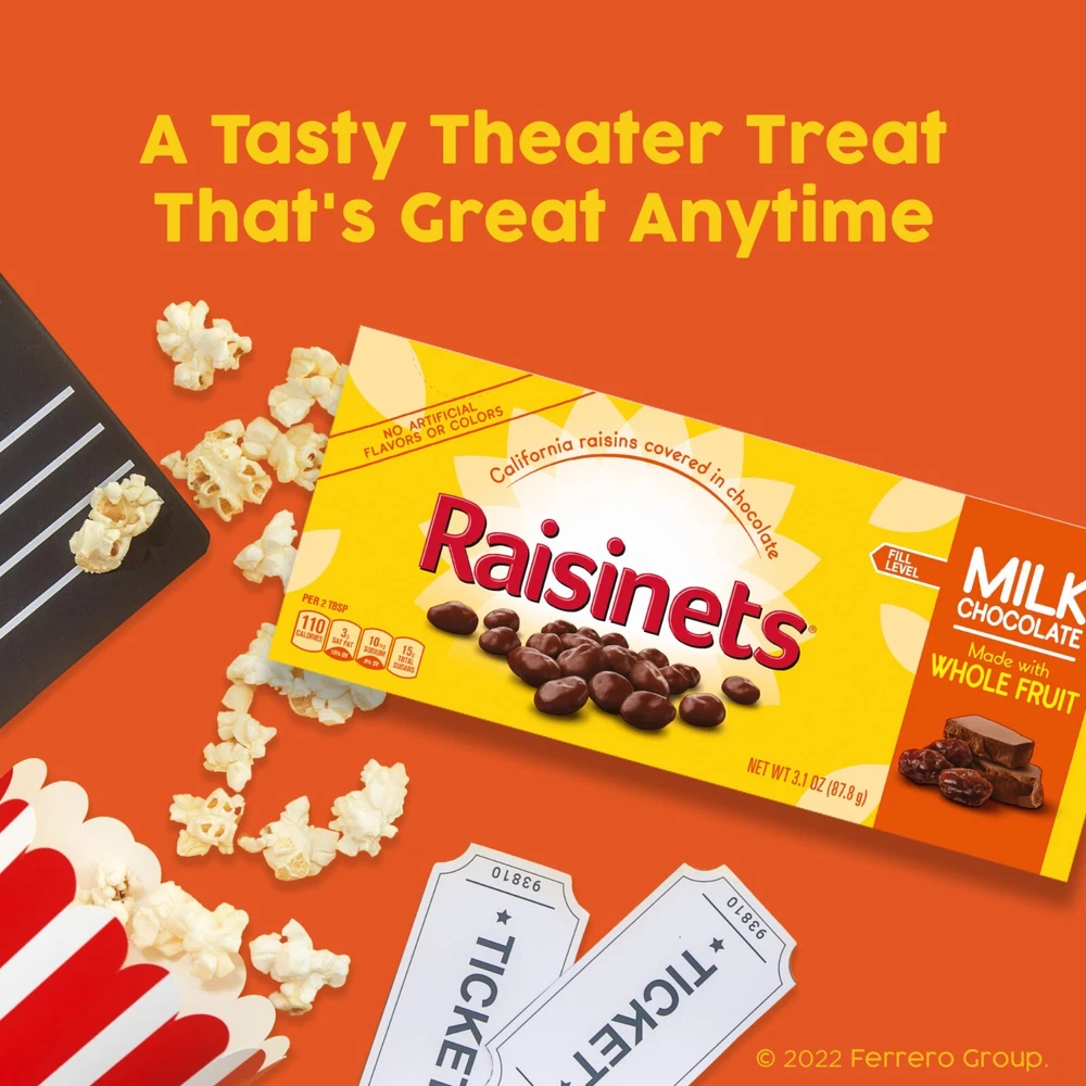 Experience the sweet and tangy delight of Raisinets California Raisins, now with a delicious milk chocolate coating. Each 3.1oz box is packed with five servings of these candied treats, offering a perfect mix of flavors to satisfy your cravings. Whether you're looking for a quick snack or something special to enjoy, these raisins covered in milk chocolate are sure to be a hit. Crafted for those who love a blend of sweet and fruity, these Raisinets are a great choice for any occasion. The convenient packaging makes it easy to store and enjoy, while the high-quality ingredients ensure that you get a product you can trust. So why wait? Grab a box today and indulge in the irresistible taste of Raisinets!