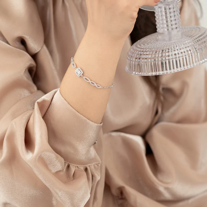 This 5 Ct Round Cut Simulated Diamond Chain Tennis Bracelet is crafted in 925 Sterling Silver. The bracelet features a lobster closure and is 7.5 inches in length. It is adorned with white simulated diamonds in a tennis link style, with excellent cut grade and prong setting. The piece is nickel-free, adjustable, and can be personalized as per the buyer's requirements. Handmade with care, this elegant bracelet is perfect for occasions like engagements, weddings, anniversaries, birthdays, and more, making it a versatile and timeless accessory.
