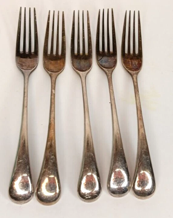 These set of 5 salad or dessert forks measure 7" in length and do have tarnish. Please see all photographs as they are part of the description. Shipped with USPS Ground Mail.
