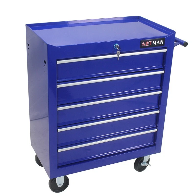 About this item : The ARTMAN tool trolley is equipped with a total of 5 drawers . The tool box is also lockable and can be used as a removable, attachable and mobile case attachment The opening and closing of the drawers of the tool cabinet is very gentle thanks to the ball-bearing drawers. The robust and powder-coated steel construction is used for high wear resistance. This assembly trolley has 4 steering wheels, 2 of which with parking brakes, so you can move the trolley freely in the garage, but also stop in one place Specification: Color: Blue Material: Cold Rolled Steel Surface Finish: Powder Coating Casters: 4" Casters (2PCS with brake and 2PCS without brake) Size :24.25*12.99*29.33 5 Drawers Dimension: 20.11*12*3.3 Weight (lbs.): 48.50