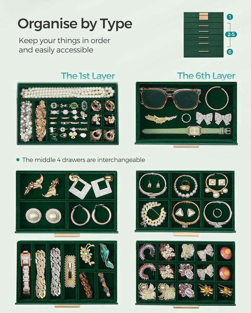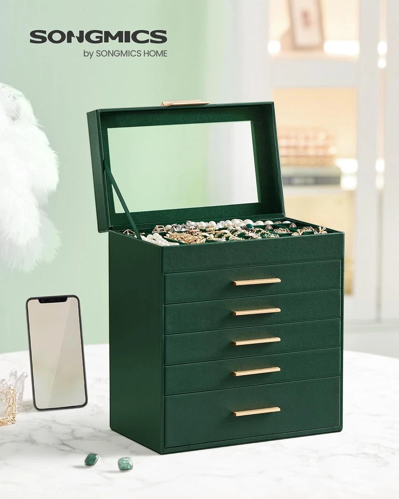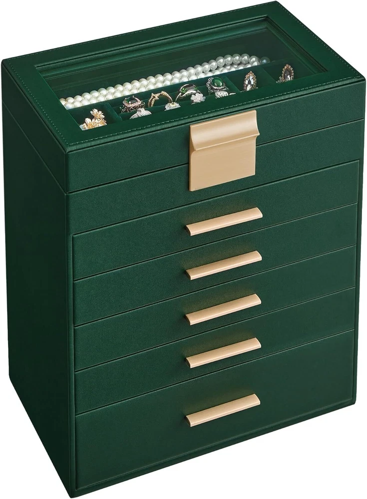 Product Description Jewelry Box with Glass Lid, 6-Layer Jewelry Organizer, 5 Drawers, for Sunglasses, Big Jewelry, Jewelry Storage, Modern Style, Forest Green and Gold Color UJBC171C01 [Storage, 6 Layers] Keep all your jewelry organized in this jewelry box—small pieces of jewelry go in the various slots of the top 5 layers, and sunglasses and watches go in the big bottom drawer [Clear Glass Lid] The see-through glass lid of this jewelry organizer allows you to see and find your favorite jewels at a glance while protecting them from dust, keeping your jewelry ready to wear and clean [Chic & Durable] Elegant green and gold colors, shiny metal handles, soft velvet lining, neat stitching, quality PU, and sturdy MDF—all these elements combined make this jewelry case stylish and durable enough for your ever-growing jewelry collection [Perfect Gift Idea] Gift this original design jewelry box to your loved ones for their birthday or anniversary to surprise them! Or, treat yourself to this fancy jewelry box—you deserve it! [Versatile Use] This modern jewelry holder looks nice whether displayed on the dresser of your bedroom or your cloakroom to organize your pins, necklaces, rings, bracelets, and other accessories About Us We are a reputable seller with many years of experience selling on eBay. Our goal is to provide high-quality products and excellent customer service. Shipping Items will be shipped within 1-3 business days when we received payment. (Orders are not processed on weekends & holidays) Tracking information will be sent once item is shipped. Delivery time depends on destination and other factors Item is shipped to ebay address. Leaving correct address can minimize delay. For international shipping and shipping to Guam, Hawaii and Alaska, Please contact us before placing the order. International buyers please note: Import duties, taxes and charges are not included in the item price or shipping charges. These charges are buyer’s responsibility. We will try our best to reduce the risk of the custom duties. Local pick-up is unavailable at the moment. Contact Us We reply any email messages within 1 business / working days(off-duty at weekend). If you do not get a response from us, then please check your junk or spam mailbox. Our Business hours: Mon-Fri 9:00-18:00, UTC/GMT +8 hours. Please contact us either by clicking "contact seller" in the "purchase history" section or simply click "ask a question" at the bottom of this page. If you are unsatisfied with our item or service, please contact us before leaving any feedback. We are committed to resolve all issues in a friendly and satisfactory manner.
