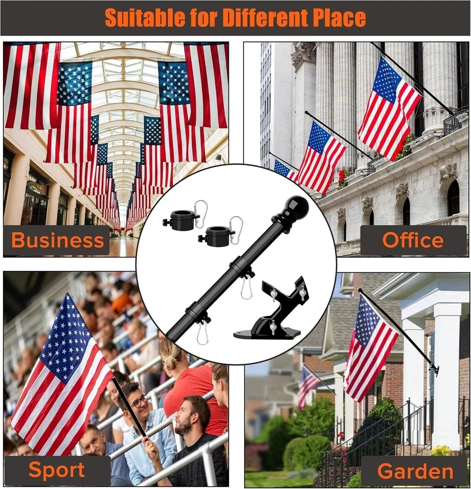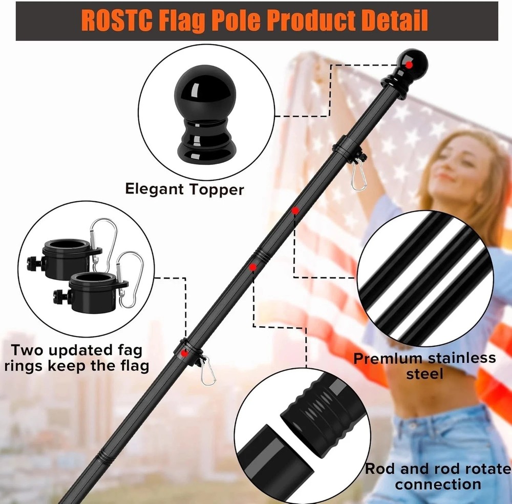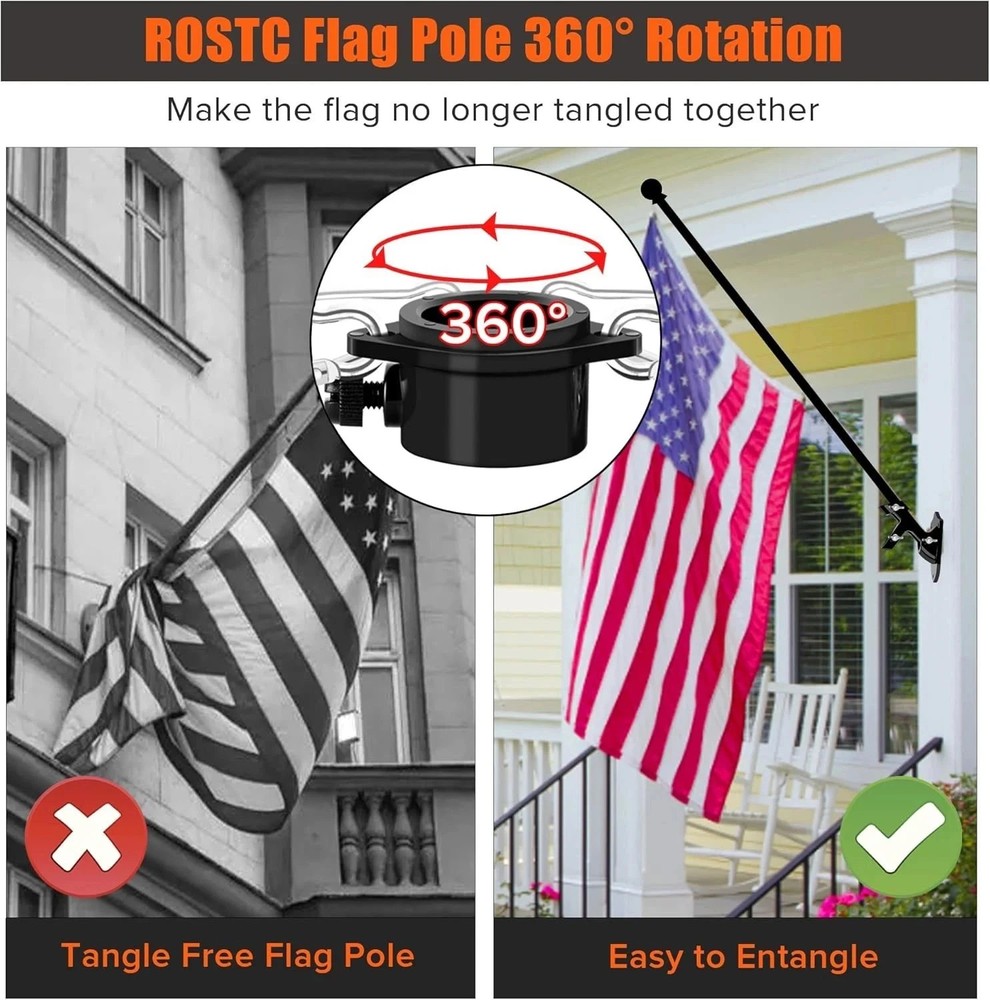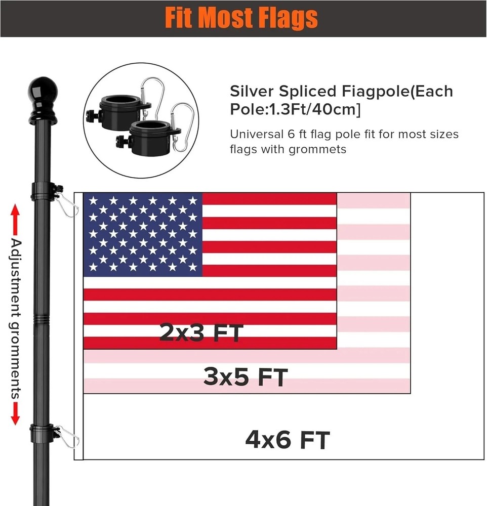 About this item: Tangle Free Design: With 360° free rotating anti-wrap rings for this spinning flag pole, allow your flags fly freely in the direction of the wind, makes it spinning without wrap around. Easy to Use , Fit Flags of Various Sizes: It is flag pole without bracket, please choose the flag pole with bracket if you want the bracket. The 5-section flag pole can be freely combined, and the length can be adjusted between 1.2 feet and 6 feet, the flag pole for house is equipped with two rotating flag mounting rings, the flag pole with adjustable length can be according to the size of your flag to install flag freely. this outdoor flag pole suitable for 2X3,3x5,4X6 flags. Rugged and Sturdy: 6 feet outdoor flag pole is made of high quality stainless steel, which is more sturdy and will not bend, break or warp. In case of breakage and bending, you can inform us immediately and we will deal with it for you in time. Widely Applications: 6Ft Flagpole kit is suitable for residential, commercial, as well as home, business, school, residential and other outside occasions, as wall mount flag pole, or as handheld flag pole for outdoor activities or sports competitions. The spinning flagpole with bracket can be installed on your house yard garden wall, porch, roofs, fences, wooden posts or truck, boat