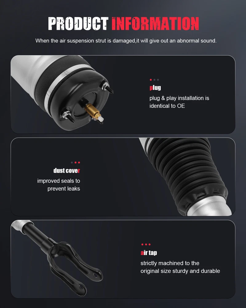 *OEM Part Number: Front Air Suspension Strut: 68029903,68029903AC,68029903AD,68029903AE,68029903AF 68029902,68029902AC,68029902AD,68029902AE,68029902AH Rear Air Suspension Spring:68029911AB,68029912AC,68029912AD,68029912AE 68258355AA,68258355AB,68258355AC Air Suspension Compressor Pump:68204387, 68232648AA , 68204730AC , 68041137AF , 68204730AB , 68041137AG , 4877128AF, 68204387AA, 68204730AG *Item Specifications: 5* Front Rear Air Suspension Shock Compressor For Jeep Grand Cherokee WK2 ZJ WJ *OEM Part Number: Front Air Suspension Strut: 68029903,68029903AC,68029903AD,68029903AE,68029903AF 68029902,68029902AC,68029902AD,68029902AE,68029902AH Rear Air Suspension Spring: 68029911AB,68029912AC,68029912AD,68029912AE 68258355AA,68258355AB,68258355AC Air Suspension Compressor Pump: 68204387, 68232648AA , 68204730AC , 68041137AF , 68204730AB , 68041137AG , 4877128AF, 68204387AA, 68204730AG *Item Specifications: Key Words: 5 PCS Front Air Suspension Shock Strut & Rear Air Suspension Spring & Air Suspension Compressor Pump For Jeep Grand Cherokee WK2 2011-2016 Quadra-Trac Package Includes: 2 PCS Front Left & Right Air Suspension Strut 2 PCS Rear Left & Right Air Suspension Spring 1PC Air Suspension Compressor Pump Notes : Please double confirm the compatibility as well as the OEM number before purchasing. Instruction is not included. Professional installation is recommended. *Compatibility Chart: 1, You can distinguish specific model of an automobile by VIN(Vehicle Identification Number). 2, VIN(Vehicle Identification Number) consists of total 17 English letters and arabic digits. 3, VIN does not include the letters I (i), O (o), and Q (q) (to avoid confusion with numerals 1 and 0). Jeep Grand Cherokee 75th Anniversary Sport Utility 4-Door 3.6L 2016 Laredo E Sport Utility 4-Door 3.6L 2012-2013 Laredo Sport Utility 4-Door 3.6L 2011-2013 Laredo Sport Utility 4-Door 5.7L 2011-2013 Laredo X Sport Utility 4-Door 3.6L 2012-2013 Laredo X Sport Utility 4-Door 5.7L 2012-2013 Limited Premium Sport Utility 4-Door 5.7L 2011-2013 Limited Sport Utility 4-Door 3.0L 2014-2016 Limited Sport Utility 4-Door 3.6L 2011-2016 Limited Sport Utility 4-Door 5.7L 2011-2016 Overland Sport Utility 4-Door 3.0L 2014-2016 Overland Sport Utility 4-Door 3.6L 2011-2016 Overland Sport Utility 4-Door 5.7L 2011-2016 Overland Summit Sport Utility 4-Door 3.6L 2012 Overland Summit Sport Utility 4-Door 5.7L 2012 SRT Sport Utility 4-Door 6.4L 2013-2016 SRT8 Sport Utility 4-Door 6.4L 2012-2015 Summit Sport Utility 4-Door 3.0L 2014-2016 Summit Sport Utility 4-Door 3.6L 2014-2016 Summit Sport Utility 4-Door 5.7L 2014-2016 * Generation & Evolution: Jeep Grand Cherokee ZJ First generation (1993-1998) WJ Second generation (1999-2004) WK Third generation (2005-2010) WK2 Fourth generation (2011-present) * Frequently Asked Questions : How to prevent the damage of air springs/How to extend the service life of air springs/struts etc.? An air strut with separable air springs If your vehicle offers a separable air suspension (Audi Allroad A6 C5, Mercedes-Benz W164, BMW X5, etc.), you should regularly (about once a week) lift the car to the maximum position, and remove dirt with a high-pressure cleaner (keep the cleaner at a distance to the air spring about 30 cm/12 inches, otherwise water pressure can damage the air spring). The highest position may vary depending on your model and regulation options. Therefore, please test this by trying the different modes available to you (Sport, comfort, dynamic, off-road) and choose the one that sets your vehicle to the highest position. The dirt will most likely be found under the fold of the pneumatic chambers. If you find a frozen layer of bitumen on the piston guide (the part of a strut on which the air spring is installed), it is recommended to clean it as well. Whenever possible, avoid riding on fresh asphalt, as fresh bitumen mixed with sand immediately results in a build-up of abrasives on the piston and in turn contributes to accelerated wear and tear of the air spring. A complete air suspension shock Many cars such as Mercedes W220 or W211 are set up with a complete air strut - shock absorber and air spring visually form a complete spare part. In many cases, you can easily recognize these by the metal cups with which the air spring is tightly mounted. To best avoid any damage, we highly recommend to regularly check the condition of the dust protection seals of the air strut. What is the difference between an air spring and an air strut? The air spring is a part of the air strut. Some vehicles (e.g. Mercedes ML) allow you to change the air spring separately. At our online shop you have the opportunity to buy either the whole air strut or only the air spring. For some type of vehicles it is not possible to change the air spring separately. In this case the whole air strut should be replaced. Which side of my car is the Right and Left? The right and left sides of an automobile are determined as if sitting in the car facing forward. Thus, the left side is on the left when sitting in the car facing forward, and the right side is on the right. For American cars, the driver’s side is on the left, and the passenger sits to the right of the driver. For cars in Japan, Britain, Ireland, the Bahamas and some other former British colonies -- where they drive on the left side of the road -- the passenger sits on the left side, and the driver (along with all the driving controls) is on the right. *Platform Drive Layout : Front Engine-Four Wheel Drive Layout Item Specifics Placement on Vehicle Left Right Front Rear Type Air Suspension Shock Fitment Type Direct Replacement Package Box Single Weight(LB) 64.064 Maximum Operating Pressure (psi) 195 Minimum Operating Pressure (psi) 90 Upper Mount Type Stud Lower Mount Type U-Bracket Included Hardware None Drive Layout Front Engine 4WD Platform WK2 Custom Bundle Yes Material Iron Aluminium Alloy Rubber Quantity 5PCS Manufacturer Warranty 1 Year OE Spec or Performance/Custo