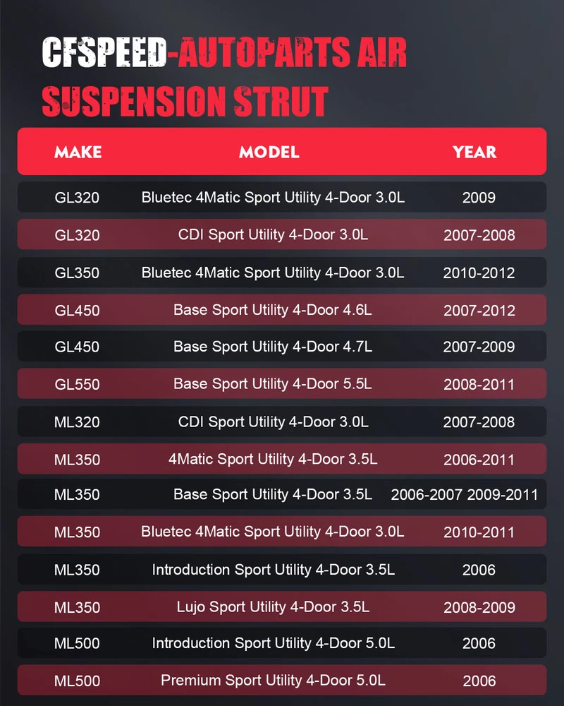 Notes: Please double confim the compatibility as well as the OEM number before purchasing. Instruction is not included. Professional installation is recommended. *OEM Part Number: Front Air Suspension Strut:1643204313,1643204413,1643204613 1643205813,1643205913,1643206013 Rear Air Suspension Strut: 1643200731,1643201131,1643202031,1643202131, 1643202731,1643202831,1643203031,1643203131 Air Suspension Compressor Pump:1643200004,1643200204,1643200304,1643200504,1643200904,1643201204 *Item Specifications: 5* Front Rear Air Suspension Shocks & Compressor For Mercedes-Benz GL/M-Class Notes : Please double confim the compatibility as well as the OEM number before purchasing. Instruction is not included. Professional installation is recommended. *OEM Part Number: Front Air Suspension Strut: 1643204313,1643204413,1643204613 1643205813,1643205913,1643206013 Rear Air Suspension Strut: 1643200731,1643201131,1643202031,1643202131, 1643202731,1643202831,1643203031,1643203131 Air Suspension Compressor Pump: 1643200004,1643200204,1643200304,1643200504,1643200904,1643201204 *Item Specifications: Key Words: 5PCS Front Air Suspension Strut & Rear Air Suspension Shock & Air Suspension Compressor Pump For Mercedes M-Class W164 ML320 ML350 ML450 ML500 ML550 GL-Class X164 GL320 GL350 GL450 GL550 With Adaptive Damping System Package Includes: 2 PCS Front Left & Right Air Suspension Strut 2 PCS Rear Left & Right Air Suspension Shock 1 PC Air Suspension Compressor Pump *Compatibility Chart: 1, You can distinguish specific model of an automobile by VIN(Vehicle Identification Number). 2, VIN(Vehicle Identification Number) consists of total 17 English letters and arabic digits. 3, VIN does not include the letters I (i), O (o), and Q (q) (to avoid confusion with numerals 1 and 0). Mercedes-Benz GL-Class GL320 Bluetec 4Matic Sport Utility 4-Door 3.0L 2009 GL320 CDI Sport Utility 4-Door 3.0L 2007-2008 GL350 Bluetec 4Matic Sport Utility 4-Door 3.0L 2010-2012 GL450 Base Sport Utility 4-Door 4.6L 2007-2012 GL450 Base Sport Utility 4-Door 4.7L 2007-2009 GL550 Base Sport Utility 4-Door 5.5L 2008-2011 Mercedes-Benz M-Class ML320 CDI Sport Utility 4-Door 3.0L 2007-2008 ML350 4Matic Sport Utility 4-Door 3.5L 2006-2011 ML350 Base Sport Utility 4-Door 3.5L 2006-2007 2009-2011 ML350 Bluetec 4Matic Sport Utility 4-Door 3.0L 2010-2011 ML350 Introduction Sport Utility 4-Door 3.5L 2006 ML350 Lujo Sport Utility 4-Door 3.5L 2008-2009 ML350 Premium Sport Utility 4-Door 3.5L 2006 ML350 Sport AMG Sport Utility 4-Door 3.5L 2010-2011 ML350 Sport AMG Sport Utility 4-Door 5.5L 2010-2011 ML450 Hybrid 4Matic Sport Utility 4-Door 3.5L 2010-2011 ML500 Base Sport Utility 4-Door 5.0L 2005-2007 ML500 Introduction Sport Utility 4-Door 5.0L 2006 ML500 Premium Sport Utility 4-Door 5.0L 2006 ML500 Special Edition Sport Utility 4-Door 5.0L 2005 ML550 Base Sport Utility 4-Door 2008-2011 * Generation & Evolution: Mercedes-Benz GL-Class X164 First generation (2007-2012) X166 Second generation (2013-present) Mercedes-Benz M-Class W163 First generation (1997-2005) W164 Second generation (2005-2011) W166 Third generation (2011-2019) W166 Sport Utility C292 Coupé Version W167 Fourth generation (2019-present) *Platform Drive Layout : Base Model-Rear Wheel Drive Layout 4Matic Model -Four Wheel Drive Layout Item Specifics Placement on Vehicle Left Right Front Rear Type Air Suspension Strut Fitment Type Direct Replacement Package Box Single Weight(LB) 80.138 Maximum Operating Pressure (psi) 160 Minimum Operating Pressure (psi) 90 Upper Mount Type Stud Lower Mount Type U-Bracket Included Hardware None Drive Layout Front Engine RWD & 4WD Platform X164 W164 Custom Bundle Yes Material Iron Aluminium Alloy Rubber Quantity 5PCS Manufacturer Warranty 1 Year OE Spec or Performance/Custom OE Spec Adjustable Yes Features Sealed Brand cfspeed-autoparts Manufacturer Part Number CF840460J01 Interchange Part Number 1643204313,1643204413,1643204613,1643205813,1643205913 OE/OEM Part Number 1643200731,1643201131,1643202031,1643202131,1643202731 Superseded Part Number 1643200004,1643200204,1643200304,1643200504,1643200904 Return Policy 30 Days Free Return Or Exchange Important Notice Just like the picture, Professional installation required Instruction Manual No Metal Fitting Connection Design Standard Hose Thread Payment PayPal preferred. Payments are expected within 7 days after the last winning auction is closed; Otherwise Unpaid Item Dispute will be filed with eBay. Shipping Product will be shipped within 2 business days after full payment is received and verified. Delivery Time is about 3-7 business days to most of countries. All domestic orders will be shipped via USPS, UPS or FedEx from our US warehouse and usually arrives to your door in about 3-5 business days. We ship the package to your shipping address in eBay instead of the one in PayPal. Please tell us your shipping address if it is different from the one in eBay. The tracking number will be given for the customer to check the shipping status online (registered or faster service only). We are not responsible for any wrong or undeliverable addresses. Please verify and update your shipping address on eBay during checkout. Returns WARNING : Cancer and Reproductive Harm - www.P65Warnings.ca.gov. We stand behind every product we sell. All of our brand new items come with a 60-Days money-back guarantee. We define the item as defective only if it doesn't function as described. It is the buyer's responsibility to understand the item description before bidding. We will replace the defective items, provided that they are in stock within the warranty period posted with the listing and the buyer return the original item and pay for the S&H cost for the replacement. We will refund the purchase price if the replacement is not available or buyer prefers a refund and send the original item back at his/her own cost. Shipping & handling cost are not refundable. Man-made damage by abuse or wrong operation is not covered by this warrant