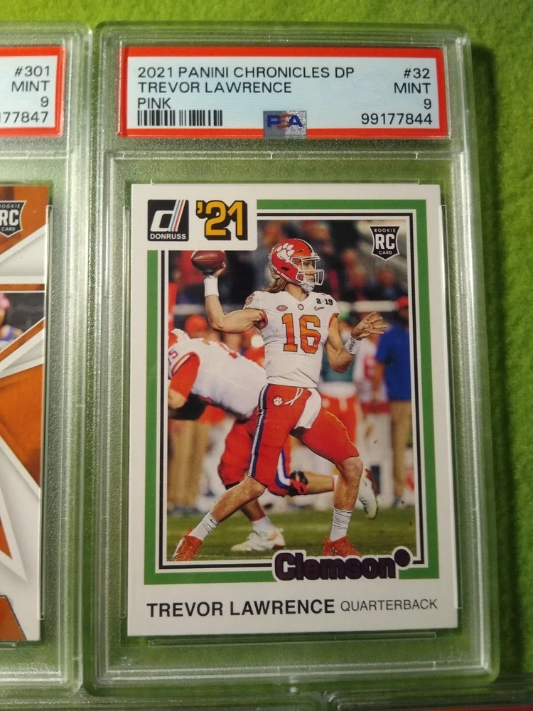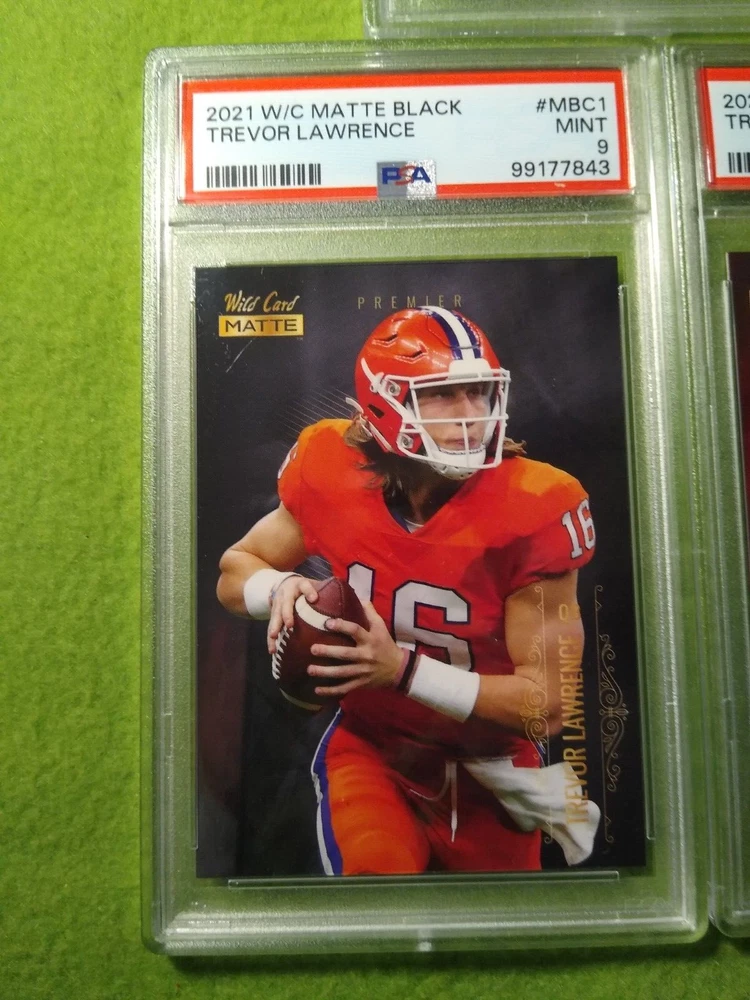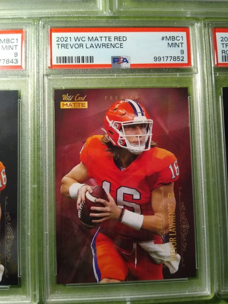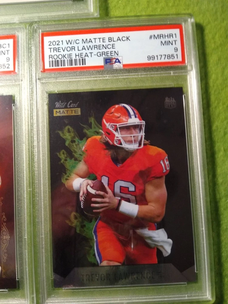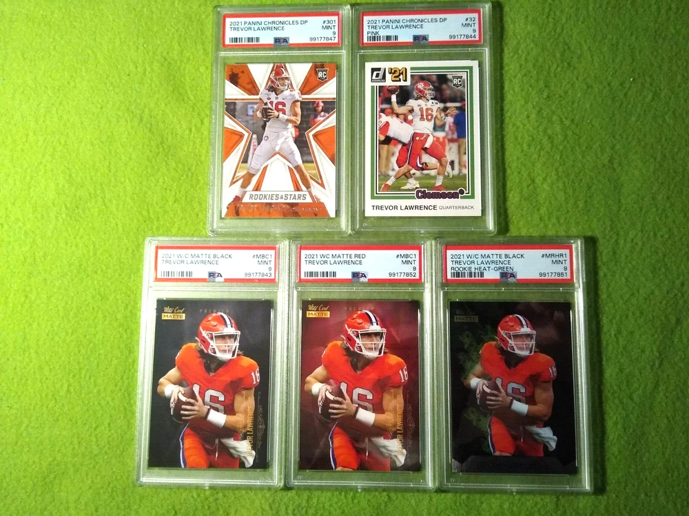 5 Graded NFL football cards-Trevor Lawrence. Included are: 1) 2021 Panini Chronicles Rookies and Stars Draft Picks, Trevor Lawrence #301 Rookie Card, PSA 9, Mint, #99177847. 2) 2021 Panini Chronicles Draft Picks - Pink, Trevor Lawrence #32 Rookie Card, PSA 9, Mint, #99177844. 3) 2021 Wild Card Matte Black Trevor Lawrence #MBC1 Rookie card, PSA 9, Mint, #99177843. 4) 2021 Wild Card Matte- Red, Trevor Lawrence #MBC1 Rookie Card, PSA 9, Mint, #99177852. 5) 2021 Wild Card Matte Black, Heat - Green, Trevor Lawrence, #MRHR1, Rookie Card, PSA 9, Mint, #99177851. Free shipping.