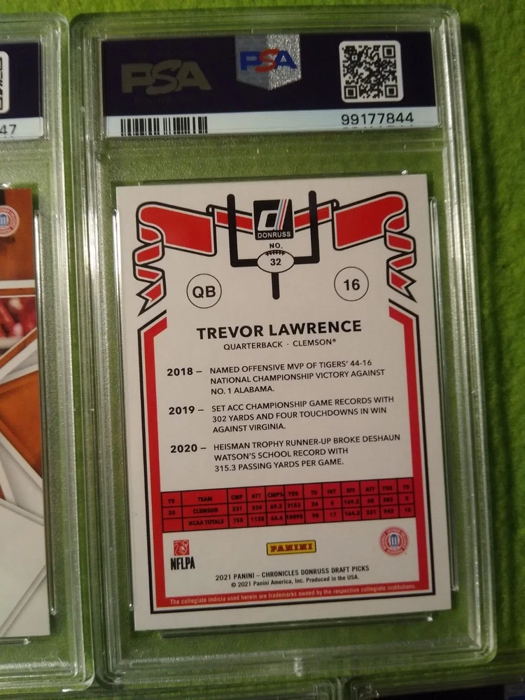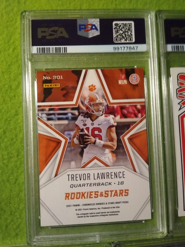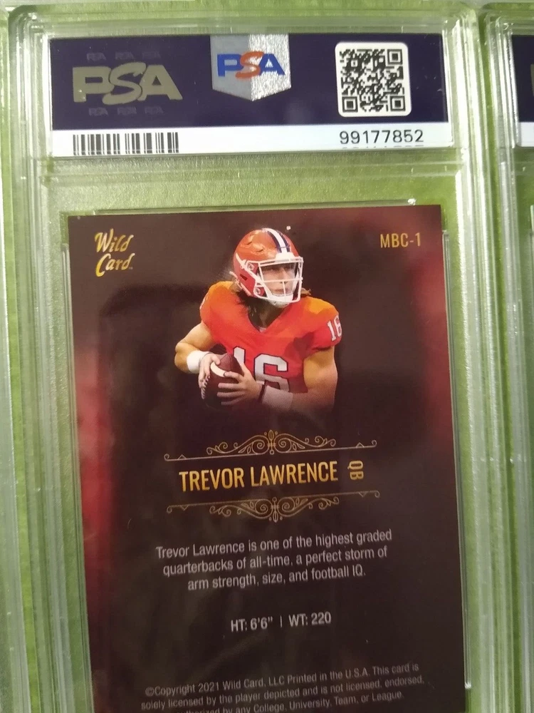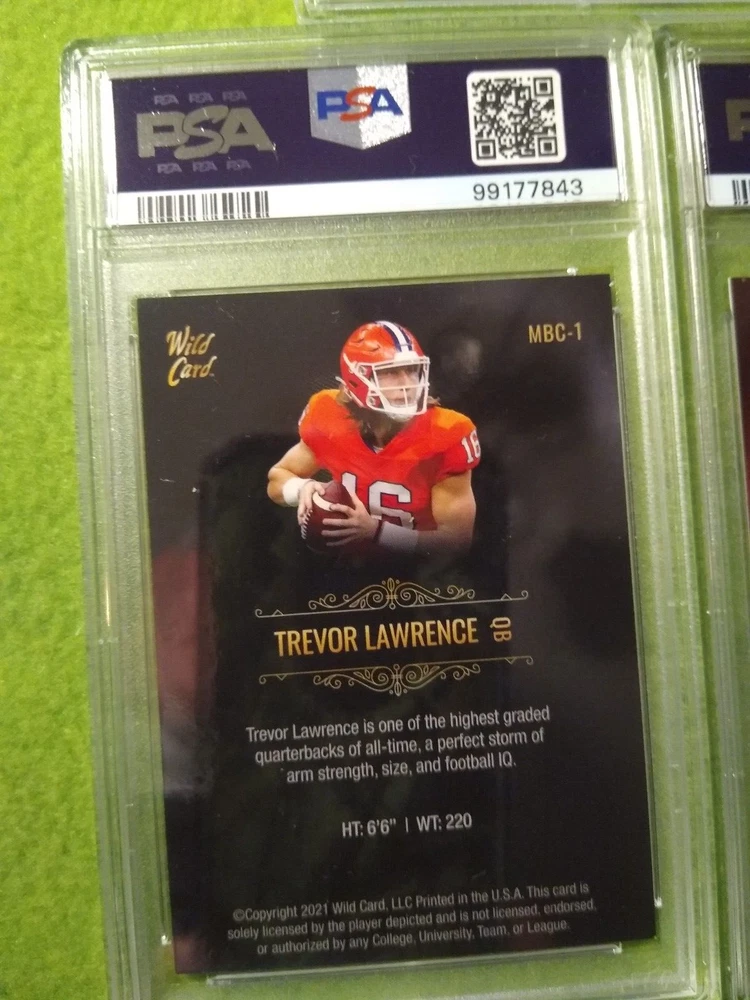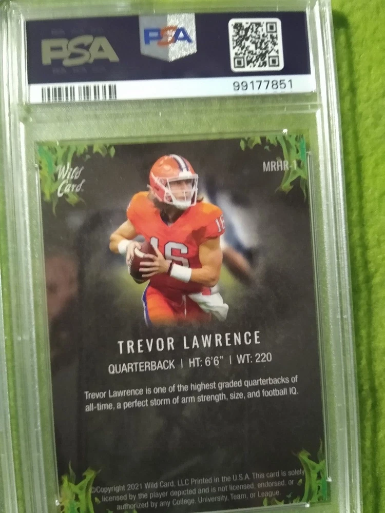 5 Graded NFL football cards-Trevor Lawrence. Included are: 1) 2021 Panini Chronicles Rookies and Stars Draft Picks, Trevor Lawrence #301 Rookie Card, PSA 9, Mint, #99177847. 2) 2021 Panini Chronicles Draft Picks - Pink, Trevor Lawrence #32 Rookie Card, PSA 9, Mint, #99177844. 3) 2021 Wild Card Matte Black Trevor Lawrence #MBC1 Rookie card, PSA 9, Mint, #99177843. 4) 2021 Wild Card Matte- Red, Trevor Lawrence #MBC1 Rookie Card, PSA 9, Mint, #99177852. 5) 2021 Wild Card Matte Black, Heat - Green, Trevor Lawrence, #MRHR1, Rookie Card, PSA 9, Mint, #99177851. Free shipping.