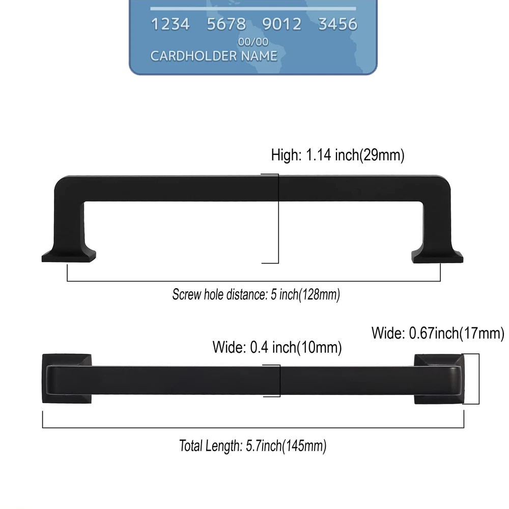Package Description: You will receive 10 handles, each with two sizes of screws, decomposable screws that you can cut off into the size you need. Each handle is packaged separately to prevent scratches Size of cabinet hardware: Hole Centers(CC): 5 inch(128MM); Overall Length: 5.7 inch(145MM); Height: 1.14 inch(29MM); Width: 0.4 inch(10MM). Please check the size of the kitchen handle you need carefully before you buy Zinc alloy pulls: Our handles are strictly processed and quality checked, sturdy and solid, easy to install and replace. We are committed to providing you with better products to update your cabinet hardware Suitable projection: The height of handles have been tested, is suitable for kinds of fingers, slim or strong, all have a comfortable grip. Easy to install and clean. Just use a cloth to wipe them and they look good as new Several scenarios: Widely used for kinds of cabinets, cupboards, wardrobe,closet and bookcase for home, kitchen, bathroom, office, or garage