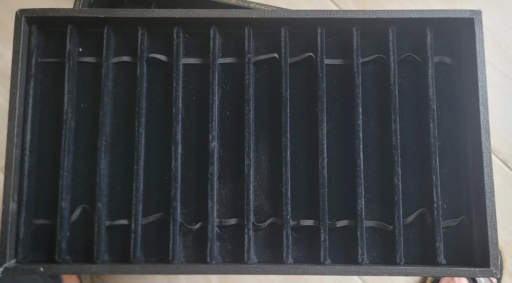 5 Jewelry trays with specialty inserts in our opinion, good shape but do not order if in doubt NO RETURN ITEM (postage too high) 2 trays with 24 item dividers---inserts are removable 2-18 item jewelry tray inserts with square velvet 2x2 inserts (pocket on back for pricing, etc)--- Only the 2x2 can be removed, the divider is fixed to tray 1 tray with removable insert for (12) bracelets, pens, etc.