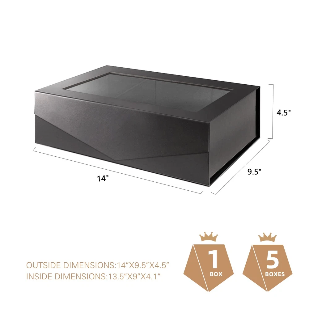 Gift Box Size: Outside measures: 14 inches(35.5 cm) × 9.5 inches(24 cm) × 4.5 inches(11.5 cm), inside dimensions:13.5 inches(34 cm) × 9 inches(22.5 cm) × 4.1 inches(10 cm). All dimensions are measured manually with deviation (range) at 1-3 mm Elegant Design: Showcase your gift in a charming way with a beautiful gift box with window, complete with a matching ribbon and card for a special touch Sturdy Construction: Made with sturdy materials, this large gift box is durable and can hold a variety of items with ease Large Boxes for Gifts: Convenient for packaging various items like scarves, perfume, or other small gifts, this gift box with window is suitable for different occasions like birthdays, weddings, Christmas and holidays More Choices: is engaged in gift boxes, paper gift bags, and other gift products Supplies. We have different colors and sizes of gift boxes and gift bags for your options. Visit our Amazon store by clicking "" next to the title