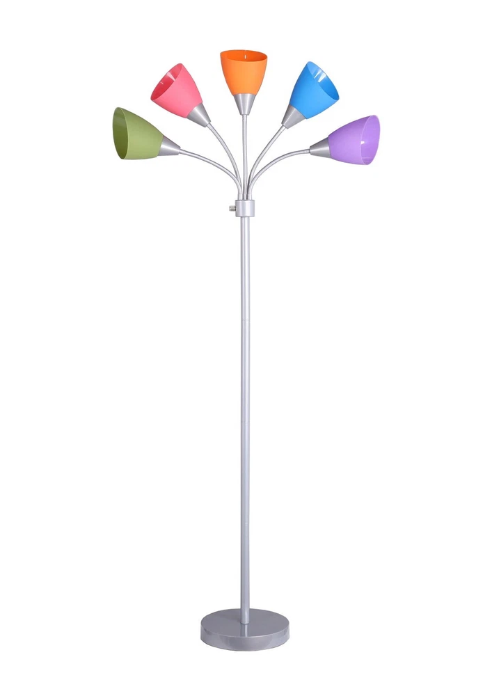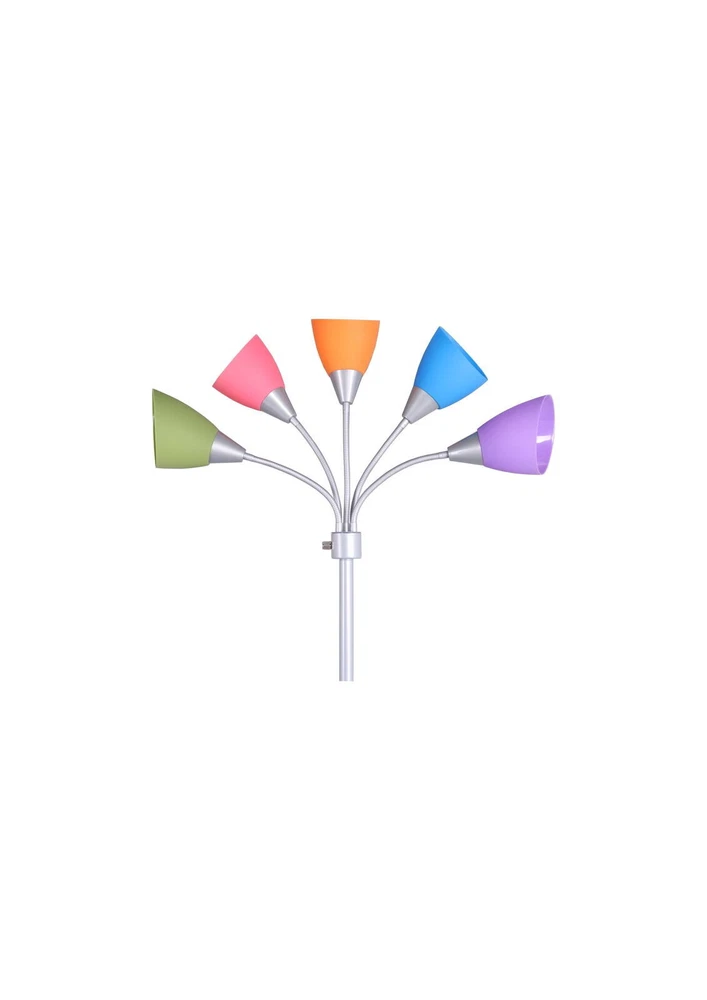 The 5-Head Silver Floor Lamp, model JK 1671-FL-SLV with multi-color pastel plastic shades, is perfect to use in kids bedroom, playroom, living room or office to add fun. Standing at a height of 67 inches, this freestanding floor lamp has a slender tubular body atop a round plastic base. It has five plastic cone shades attached to the top with flexible gooseneck arms to focus light where you need it, and a variable multi-head setting to allow versatile lighting options to illuminate all the lights or just a few at a time. It requires 5x60W or 9W LED bulbs (sold separately). Add this fun and vibrant 5-head floor lamp to your home for a unique look next to a sofa or a rm-chair to add versatile adjustable lighting to your living room, den, dorm, office, kids bedroom or playroom. This lamp is easy to maintain and easy to assemble. Adult use. Overall height 67" Classic Modern Styling Silver finish with multi-color plastic shades Teen or adult use Easy 4-way turn knob switch Sturdy metal base 5 plastic shades - multi color On Nov 16, 2024 at 04:35:08 PST, seller added the following information:
