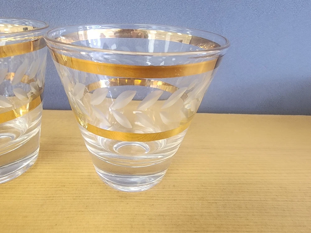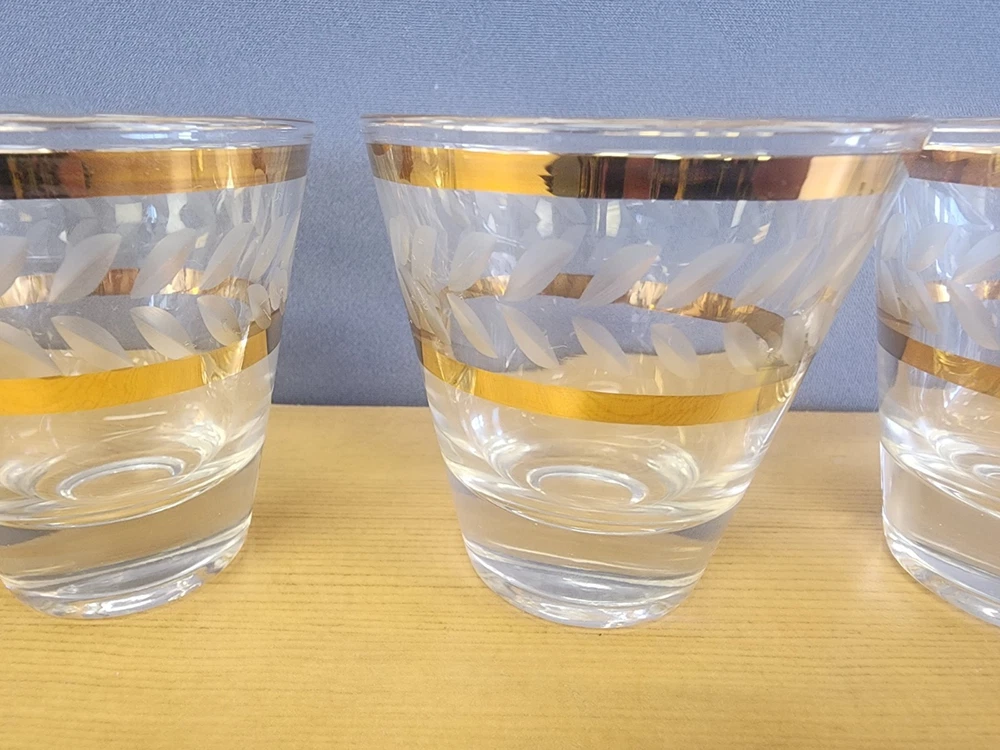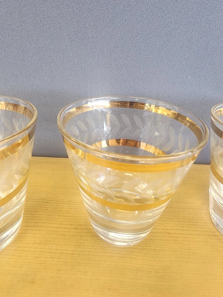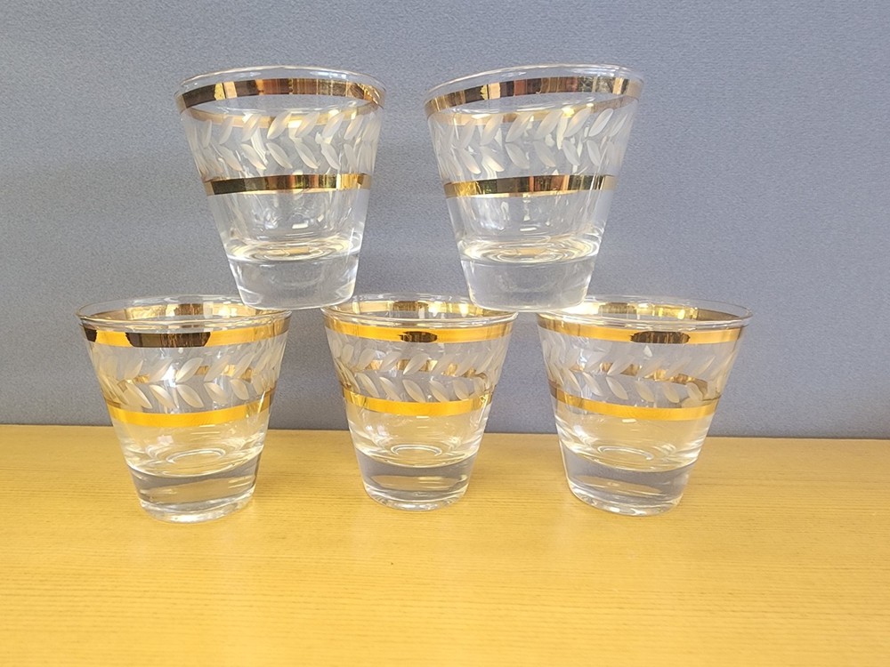 Set Of 5 beautiful elegant somewhat delicate drinking glasses. Each one features an etched design and a double gold band. Thick glass bottom. Great for use in the bar or dining room. Great condition, but not perfect. Please examine pictures carefully prior to purchase and ask questions if you have any