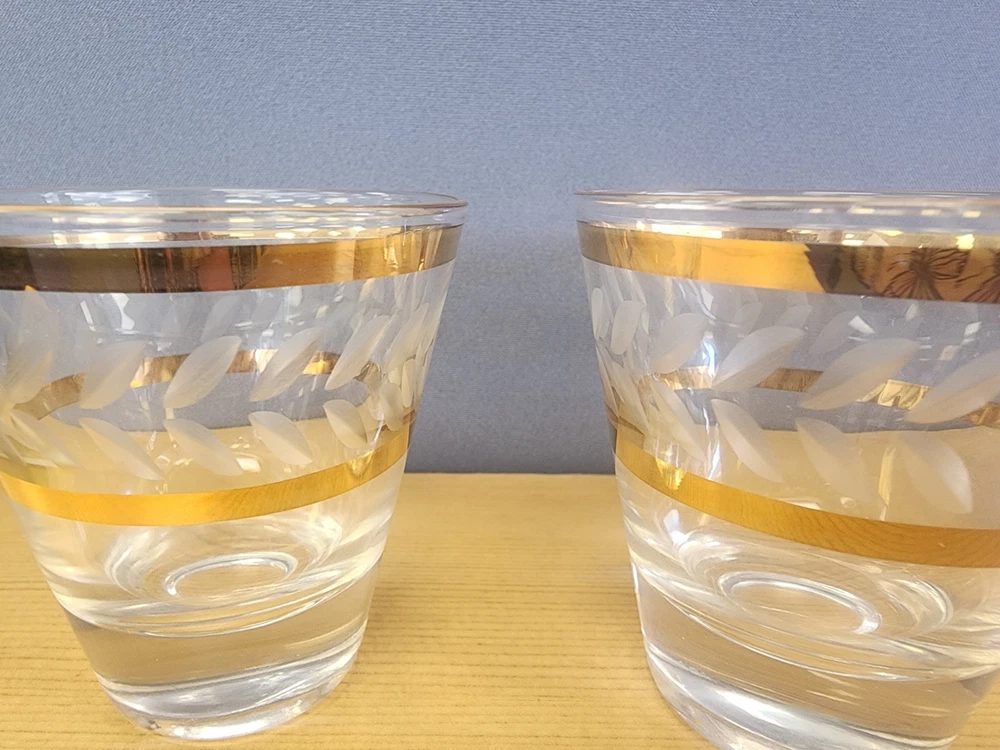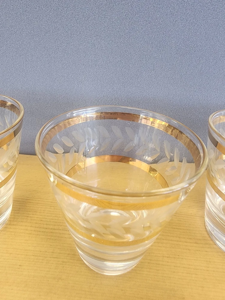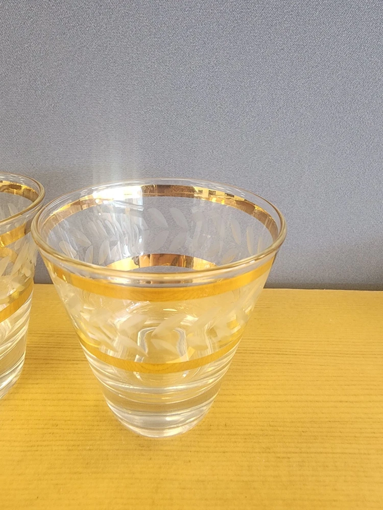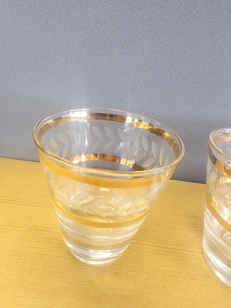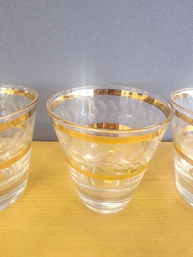 Set Of 5 beautiful elegant somewhat delicate drinking glasses. Each one features an etched design and a double gold band. Thick glass bottom. Great for use in the bar or dining room. Great condition, but not perfect. Please examine pictures carefully prior to purchase and ask questions if you have any
