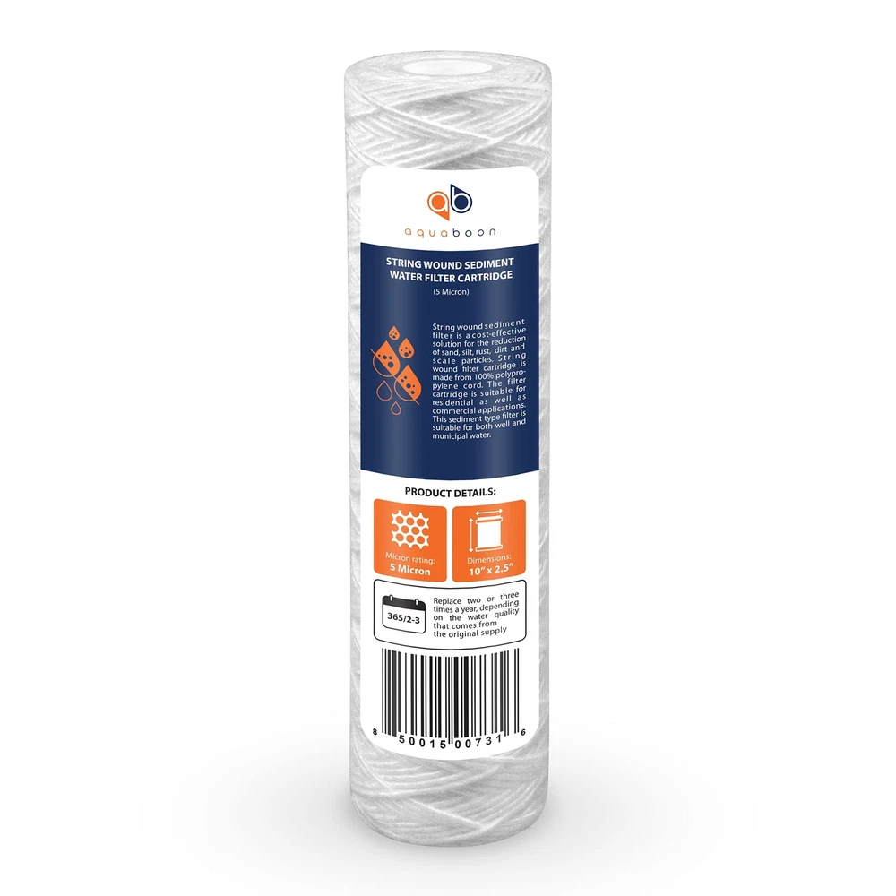 6 OF 5 MICRON 10'' X 2.5" STRING WOUND SEDIMENT PP WATER FILTER REPLACEMENT CARTRIDGE BY The string wound sediment filter is a cost-effective solution for the reduction of sand, silt, rust, dirt and scale particles. String wound filter cartridge is made from 100% polypropylene cord. The filter cartridge is suitable for residential as well as commercial applications. This sediment type filter is suitable for both well and municipal water. Features: Micron rating: 5 Micron Dimensions: 10” x 2.5” Lifetime: Replace two or three times a year, depending on the water quality that comes from the original supply Larger particles are trapped in the outer layers; smaller particles penetrate deeper Thermally bonded polypropylene micro fibers for purity and chemical compatibility No surface binders to reduce flow and increase change-out frequency Cartridge is individually shrink wrapped COMPATIBLE FILTERS AND HOUSINGS: American Plumber W5W, WP5, 155186-52, WP-5, Ametek WP-5, Aqua-Pure AP110, AP010, Bruner WP-5, Bunn ED-S-1, S5-10, Campbell ISS, ClearChoice 84621, Whirlpool WHKF-WHSW, WHCF-WHSW, Cornelius COR105, COR120, Culligan P5, WP-5, Cuno CFS110, Dupont WFPFC4002, PFC4002, Durable Manufacturing 5WPP10, Ecolab 9320-1135, Everpure DEV910908, Evoqua Advantage FCPXF0905, Flotec RS2-D12-02, RS2-DS, P5 155014-43, RS2-DS12-05, RS2-SS, RS2-D12-01, Hydronix SWC-25-1005, Keystone W5, Kleen Plus WP-5, Liquatec SWF-25-1005, Manitowoc K-00173, K-00069, Neo-Pure WPP-25098-05, NuCalgon 4712-87, OmniFilter RS5, RS2-SS, RS5-SS, RS5SS, RS5-DS, RS5-D, RS5-S, RS-5, RS5D, RS5DS, Pentair DEV910908, Pentek WP-5, CW-MF, WP5, CW-5, 155071-43, Puremark PFS105, SW05-S, Selecto 101-230, Tier2 RS5-934, US Filter WP-5, etc. Fits most 10 inch Standard size Housings like Dupont PF 2800, PF 3800 Series Housings, WFPF38001C. Crystal Clear Filtration at Its Best: Experience superior filtration with 's string wound water filter. Our 10 inch water filter cartridge captures even finer particles of rust and dirt, with its innovative winding density. Perfect Fit, Perfect Performance: Our whole house filter seamlessly integrates with your whole house water filter system. This 5 micron water filter 10 x 2.5 is universally compatible with under-sink, countertop, and reverse osmosis systems. Longer Life, Less Fuss: Our whole house water filter replacement features enhanced dirt-holding capacity, meaning fewer changes. With graded density, the water filter cartridge traps more debris, extending the life of your house water filter. Extended Protection, Lasting Purity: With an optimized design, our water filter 10 x 2.5 cartridge works harder and lasts longer. Enjoy up to 6 months of effective sediment removal with whole house filter cartridge, depending on the well water quality. Pure Taste, Clean Water: Eliminate unpleasant tastes and odors with our string wound water filter cartridges. Enjoy every drop from your whole house water filter system for well water without worrying about contaminants. Consistent Flow, No Pressure Drop: Our 5 micron water filter ensures optimal water flow with minimal pressure drop, even in high-sediment environments. This rope filter keeps your home’s water running smoothly, ensuring efficiency and performance. Easy Installation, Quick Maintenance: Designed for easy setup, whole house water filter cartridge fits standard 10 inch water filter housings, making installation a breeze. The quick cartridge replacement process ensures your system remains effective. Versatile Filtration for Every Home: Whether filtering municipal or well water, our whole house filter is ideal for any house water filter system. Its adaptability ensures clean, filtered water across various applications and setups. Compatible 10 inch Water Filter Cartridges: Compatible with Aqua Pure AP110 water filter cartridge, AP010, Culligan P5, 155186-52, American Plumber W5W, Ametek WP-5, Bruner WP-5, ClearChoice 84621, Whirlpool WHKF-WHSW, Cuno CFS110, Dupont WFPFC4002, etc. Compatible 10x2.5 Water Filter Housings: Compatible with OmniFilter RS5, Neo-Pure WPP-25098-05, Pentair DEV910908, Pentek WP-5, CW-MF, WP5, CW-5, etc. Fits most Standard 10 inch size housings like Dupont PF 2800, PF 3800 Series, WFPF38001C.