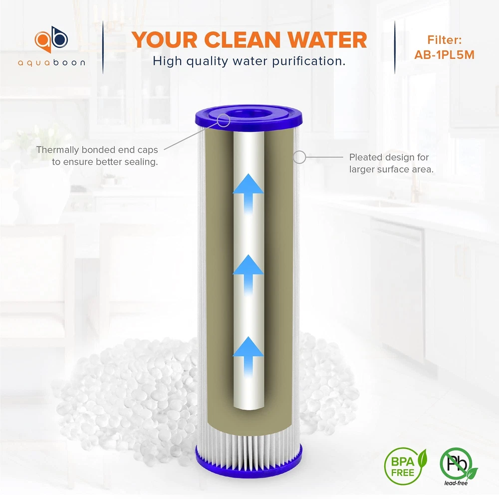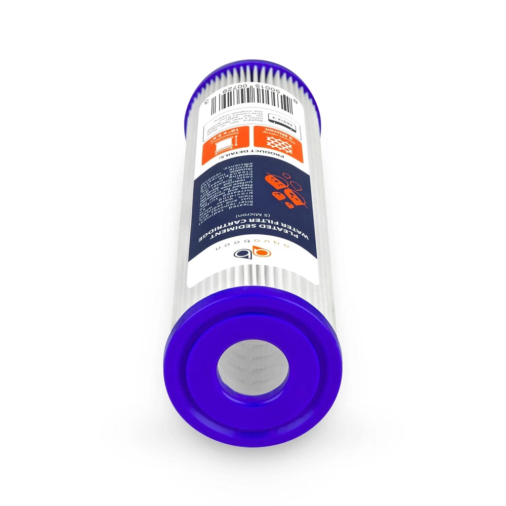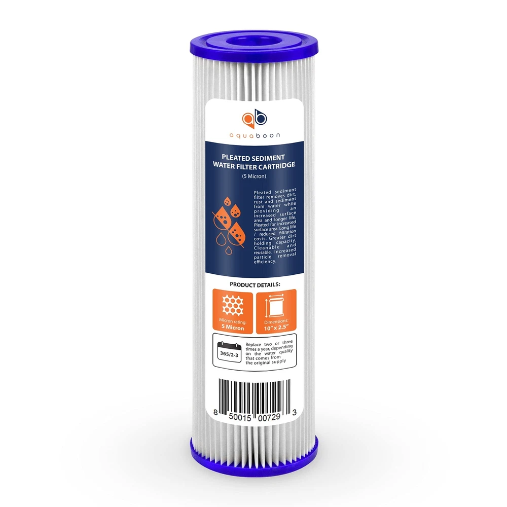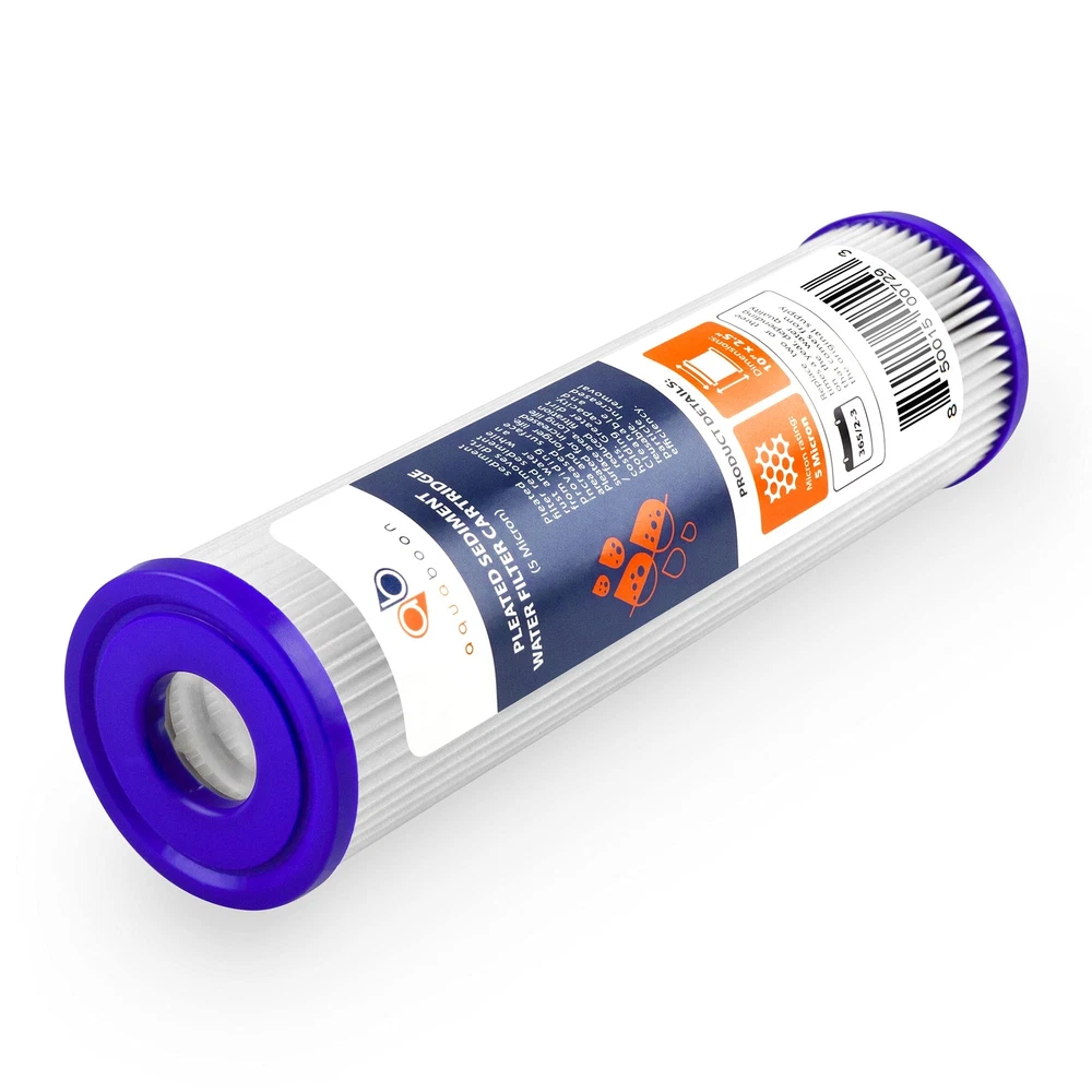 Precision Filtration at 5 Microns: ’s 5 micron sediment filter offers precision filtering for well water. Made of non-woven polyester, pleated water filter cartridge captures sand, rust, and dirt, transforming water into a refreshing experience. Long-Lasting Pleated Filter Design: Enjoy an extended lifespan with our 10x2.5 water filter cartridges. The pleated structure provides greater dirt-holding capacity, meaning fewer filter replacements, so this way reducing maintenance. Effortless & Universal Fit: Designed for universal compatibility, pleated 5 micron water filter fits perfectly into 10-inch water filter housing. Whether for an RO system or whole home water filtration setup, this home water filter integrates seamlessly. Superior Protection for Your Plumbing: This whole house sediment filter not only improves your water quality but also protects plumbing and appliances. By capturing sediment and rust particles, whole house filter reduces the risk of clogs and corrosion. Consistent Water Pressure, No Compromise: water filter replacement cartridge’s large surface area ensures efficient filtration while maintaining a steady flow rate, giving you the best of both worlds—clean filtered water and strong pressure. Reusable, Sustainable Water Filtration: Our water filters cartridges offer a sustainable choice for eco-conscious consumers. Designed for reuse, this house water filter reduces waste, making it a smart option for your whole house water filtration system. Exceptional Well Water Filtration: This sediment filter replacement excels in capturing the unique impurities found in groundwater sources. It’s an ideal choice for households looking to enhance the purity of water without compromising on performance. Non-Woven Polyester Durability: Constructed from high-quality non-woven polyester, pleated water filter is built to last. Its robust material resists chemicals and wear, ensuring reliable performance in your house water filter system over the long term. Maximum Filtration, Minimum Maintenance: With ’s well filter replacements, you get superior filtration and minimal upkeep. The design of 10 inch water filter maximizes sediment capture while minimizing the need for replacements. Compatible House Water Filter Models: Compatible with American Plumber W50PE, Ametek R50, Culligan R50, Dupont WFPFC3002, Brita WHF-101, Liquatec SPF-25-1050, Whirlpool WHKF-WHPL, Pentek 155038, Watts FM-50-975, etc. Fits most 10" water filter housings.