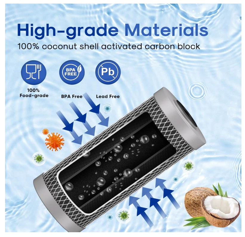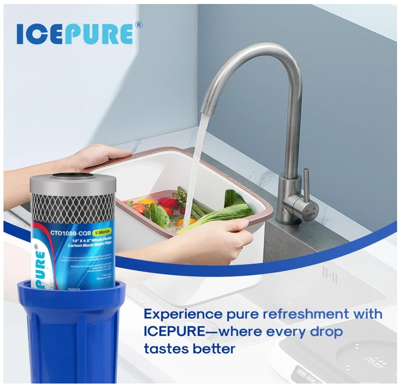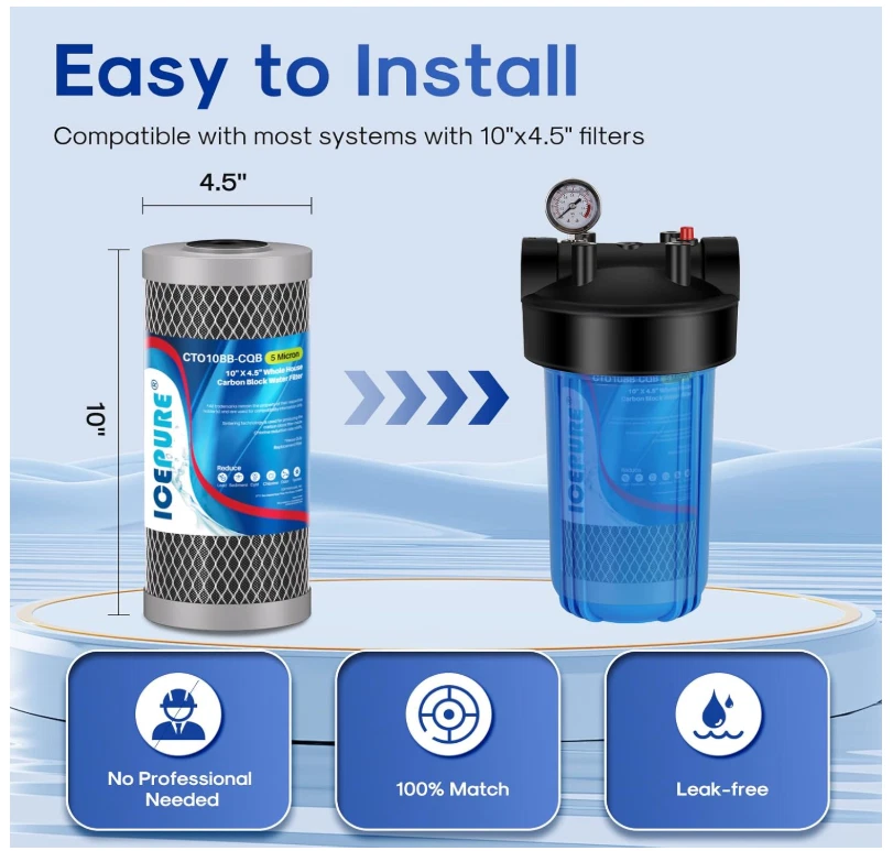 Upgraded Premium Carbon Block – ICEPURE whole house carbon block has upgraded, and its special formula enhances adsorption and filtration performance,to remove many harmful substances you worry about lead, chlorine, odor, Cyst, Dust, Sand and impurities, Reducing your concerns about chlorine, Chloramine and heavy metals lead. Efficient Filtration - This filter is made with innovative Sintering Technology, which helps to remove Chlorine, Lead and other impurities. This filter can remove finer particles and sediment. Delivering cleaner water that tastes great provides a wonderful drinking experience for your whole family. This filter has a life span of up to 30000 gallons depending on your water quality. For optimum performance, we recommend you change the filter every 6 months based on water quality. Superior Material - Our 4.5'' X 10'' whole house enhanced carbon water filter has Durable materials, food-grade, lead-free, and BPA-free. This kind of filter is recommended for tap water filtration. If your water source is well water, this filter may not achieve the filtering effect that you expect, because well water contains large particles such as mud and sands which may clog the filter in shorter time. Easy to Install - Installing and replacing the filter cartridge is incredibly simple and effortless, requiring no tools. It conveniently fits into a variety of filtration systems and can also be used as a standalone cartridge. Regular replacement is recommended to maintain optimal filtration performance. The straightforward process allows you to replace the filter in minutes, ensuring consistent water quality without disruption to your daily routine. High Standards - ICEPURE water filters use US technology and teams. The ICEPURE brand has high requirements for products, and every product that is manufactured must go through 5 inspection and testing stages, ensuring that every product meets our high expectations.