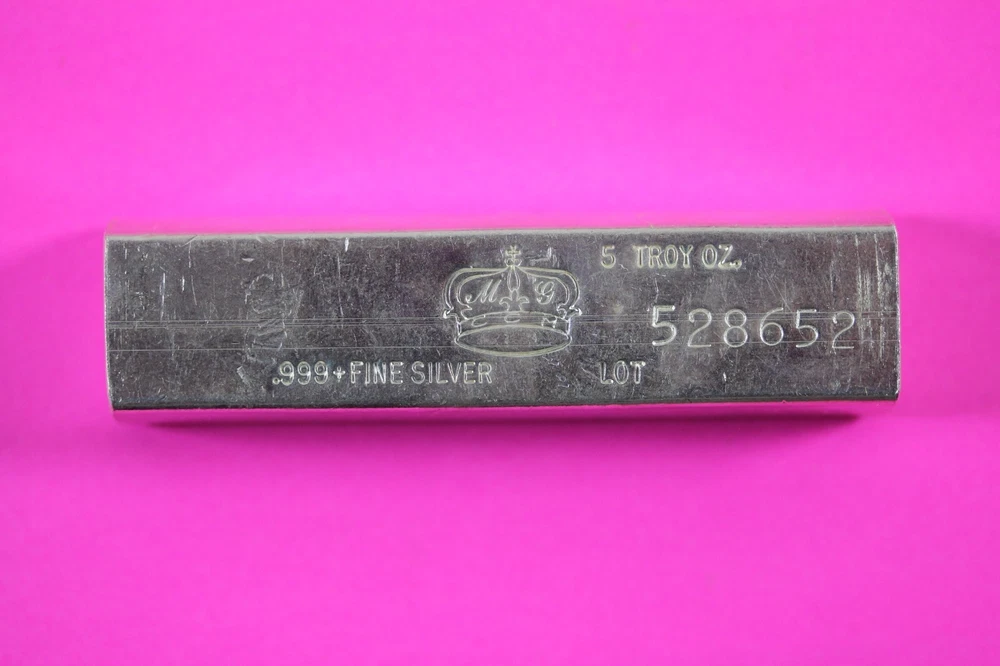 Total Precious Metal Content: 5 oz Precious Metal Content per Unit: 5 oz Composition: Silver Year: Unknown Shape: Bar Country/Region of Manufacture: United States Brand/Mint: MG Fineness: 0.999