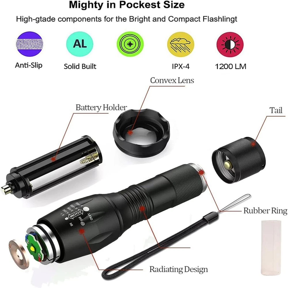 Specification 1) Type of flashlight: handheld flashlight 2) Adjustable Focus: can adjust its focus for different usage 3) Output brightness: The best output brightness was powered by 18650 battery 4) Internal wiring applies the high efficient booster circuit, working voltage is wide and can utilize the batteries in the largest extent 5) Waterproofing design(But Can't put it into water directly) 6) 5 switch Modes: high / middle / low / strobe / SOS 7) Made of high quality aluminum alloy, this flashlight is sturdy and durable enough for long time daily using 8) Lamp base: high power LED. With a lifespan of up to 100,000 hours or more, no need to consider replacing the cap for the whole life 9) Power by: 1 x 18*65mm 3.6v/3.7v OR 3X AAA battery(Battery not included) Package: 5x Tactical Flashlight 5x Plastic tube for using 18650 battery 5x AAA battery holder for using AAA battery ✔Adjustive Focus:1200 lumens(Max),spotlight for long range observation;floodlight for large area illumination ✔Powe Source:1x18*65mm Battery/3xAAA Batteries(not include) ✔5 Modes Switchable:high - medium - low - sos - Strobe,the light will change to different mode by pushing the button,easy to operate ✔Advance Design:Skid-proof design and Water assistant.Easy to carry and use