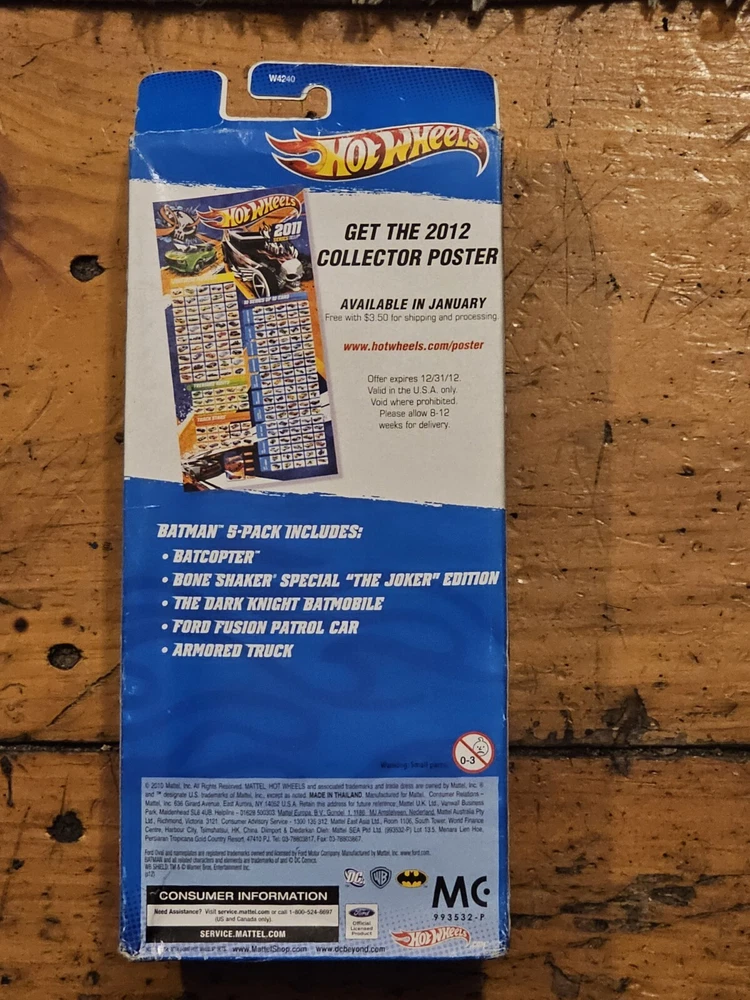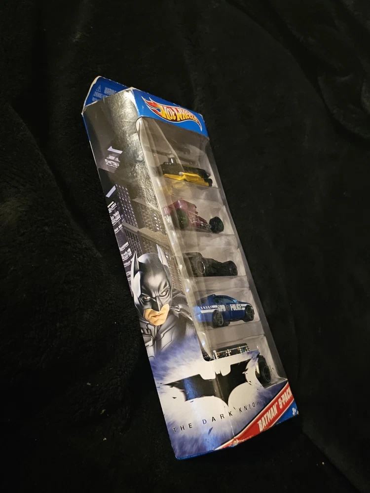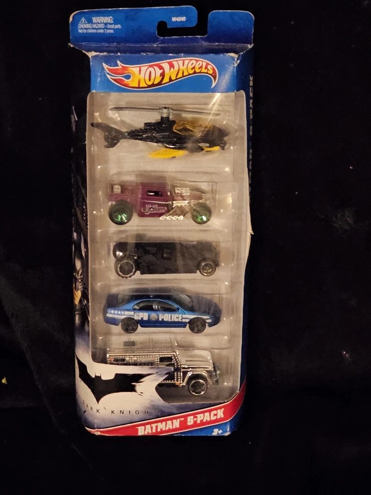 This is a set of 5 Batman Hot Wheels cars, featuring the iconic Batmobile from the 2011 Batman movie. These diecast cars are 1:64 scale and come in an unopened box. The Hot Wheels brand is known for its high-quality and collectible diecast cars, and this set is no exception. The cars are multi-colored and feature the Batman theme, with the model number 4240. They are recommended for children ages 3 and up, and are perfect for both boys and girls. These Hot Wheels cars are part of the Hot Wheels Batman series, and are a must-have for any Batman fan or collector.