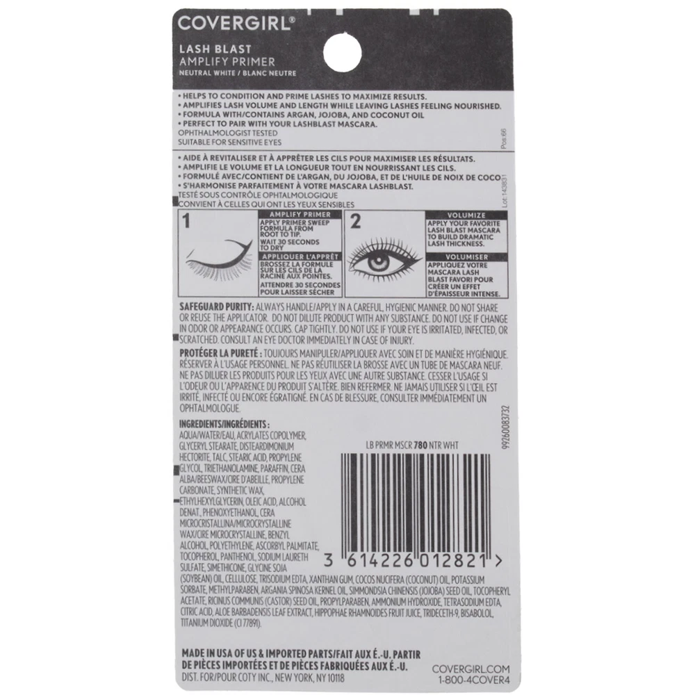Product Description Amp those lashes up with Covergirl Lash Blast Amplify Eyelash Primer. Designed to maximize the results of your favorite Covergirl mascara, this primer gives your lashes an instant lash boost for fuller, longer lashes. Evenly coat every lash from root to tip with the creamy lightweight formula that glides on smooth. Lashes feel stronger and healthier thanks to nourishing argan, jojoba, and coconut oils. COVERGIRL Lash Blast Amplify Primer 780 Neutral White - 0.44 fl oz - INSTANT LASH BOOST: Eyelash primer maximizes the look of your favorite Covergirl mascara - FROM ROOT TO TIP: Lashes look thicker and longer from root to tip - CREAMY FORMULA: The creamy, lightweight formula glides on evenly to coat every lash - HEALTHIER LASHES: Nourishing argan, jojoba, and coconut oils strengthen and condition lashes - CRUELTY-FREE: Covergirl products are Leaping Bunny Certified by Cruelty-Free International, meaning they are never tested on animals Ingredients Aqua/Water/Eau, Acrylates Copolymer, Glyceryl Stearate, Disteardimonium Hectorite, Talc, Stearic Acid, Propylene Glycol, Triethanolamine, Paraffin, Cera Alba/Beeswax/Cire D'Abeille, Propylene Carbonate, Polyvinyl Alcohol, Synthetic Wax, Ethylhexylglycerin, Oleic Acid, Alcohol Denat., Phenoxyethanol, Benzyl Alcohol, Polyethylene, Ascorbyl Palmitate, Microcrystalline Cera/Microcrystalline Wax/Cire Microcrystalline, Panthenol, Glycerin, Sodium Laureth Sulfate, Cellulose, Trisodium EDTA, Xanthan Gum, Tocopherol, Potassium Sorbate, Methylparaben, Aloe Barbadensis Leaf Extract, Argania Spinosa Kernel Oil, Cocos Nucifera (Coconut) Oil, Dimethicone, Ricinus Communis (Castor) Seed Oil, Simmondsia Chinensis (Jojoba) Seed Oil, Tocopheryl Acetate, Glycine Soja (Soybean) Oil, Propylparaben, Ammonium Hydroxide, Tetrasodium EDTA, Silica Dimethicone Silylate, Glyceryl Oleate, Citric Acid, Ethylene/Propylene Copolymer, Methylcellulose, Hippophae Rhamnoides (Seabuckthorn) Extract, Trideceth-9, Bisabolol, Benzoic Acid, Sorbic Acid, Sulfuric Acid. [May Contain/Peut Contenir/+/-: TITANIUM DIOXIDE (CI 77891) Product Description Amp those lashes up with Covergirl Lash Blast Amplify Eyelash Primer. Designed to maximize the results of your favorite Covergirl mascara, this primer gives your lashes an instant lash boost for fuller, longer lashes. Evenly coat every lash from root to tip with the creamy lightweight formula that glides on smooth. Lashes feel stronger and healthier thanks to nourishing argan, jojoba, and coconut oils. COVERGIRL Lash Blast Amplify Primer 780 Neutral White - 0.44 fl oz - INSTANT LASH BOOST: Eyelash primer maximizes the look of your favorite Covergirl mascara - FROM ROOT TO TIP: Lashes look thicker and longer from root to tip - CREAMY FORMULA: The creamy, lightweight formula glides on evenly to coat every lash - HEALTHIER LASHES: Nourishing argan, jojoba, and coconut oils strengthen and condition lashes - CRUELTY-FREE: Covergirl products are Leaping Bunny Certified by Cruelty-Free International, meaning they are never tested on animals Ingredients Aqua/Water/Eau, Acrylates Copolymer, Glyceryl Stearate, Disteardimonium Hectorite, Talc, Stearic Acid, Propylene Glycol, Triethanolamine, Paraffin, Cera Alba/Beeswax/Cire D'Abeille, Propylene Carbonate, Polyvinyl Alcohol, Synthetic Wax, Ethylhexylglycerin, Oleic Acid, Alcohol Denat., Phenoxyethanol, Benzyl Alcohol, Polyethylene, Ascorbyl Palmitate, Microcrystalline Cera/Microcrystalline Wax/Cire Microcrystalline, Panthenol, Glycerin, Sodium Laureth Sulfate, Cellulose, Trisodium EDTA, Xanthan Gum, Tocopherol, Potassium Sorbate, Methylparaben, Aloe Barbadensis Leaf Extract, Argania Spinosa Kernel Oil, Cocos Nucifera (Coconut) Oil, Dimethicone, Ricinus Communis (Castor) Seed Oil, Simmondsia Chinensis (Jojoba) Seed Oil, Tocopheryl Acetate, Glycine Soja (Soybean) Oil, Propylparaben, Ammonium Hydroxide, Tetrasodium EDTA, Silica Dimethicone Silylate, Glyceryl Oleate, Citric Acid, Ethylene/Propylene Copolymer, Methylcellulose, Hippophae Rhamnoides (Seabuckthorn) Extract, Trideceth-9, Bisabolol, Benzoic Acid, Sorbic Acid, Sulfuric Acid. [May Contain/Peut Contenir/+/-: TITANIUM DIOXIDE (CI 77891) Suggested Use Step 1. Apply primer sweep formula from root to tip Step 2. Wait 30 seconds to dry Step 3. Apply your favorite Lash Blast mascara to build dramatic lash thickness Warnings Always handle/apply in a careful, hygienic manner. Do not share or reuse the applicator. Do not dilute product with any substance. Do not use if change in odor or appearance occurs. Cap tightly. Do not use if your eye is irritated, infected or scratched. Consult an eye doctor immediately in case of injury Disclaimer The product descriptions and instructions provided by vitabox.com are for informational purposes only and are qualified in their entirety by the information available from manufacturers of the products. You should carefully read all product packaging, and contact the manufacturer with any questions before using a product. While we endeavor to ensure that product descriptions are current, manufacturers sometimes change their products. We are not liable for inaccuracies or misstatements about products. We do not provide medical advice or recommendations. You should not use the information provided by vitabox.com for diagnosing or treating a health problem or disease. If you have or suspect that you have a medical problem, immediately contact your health care provider. Information and statements regarding dietary supplements have not been evaluated by the Food and Drug Administration or any other government agency and are not intended to diagnose, treat, cure, or prevent any disease.