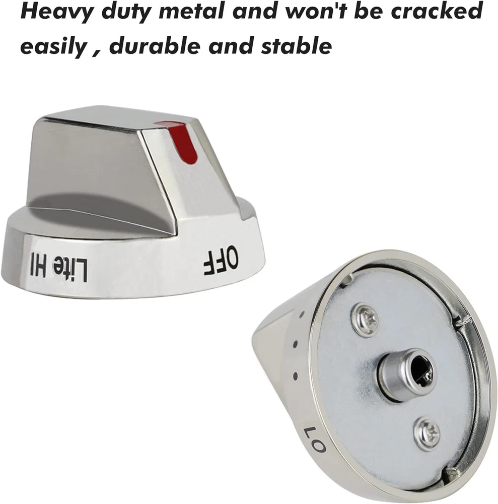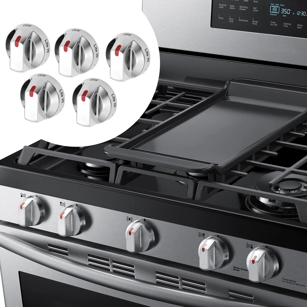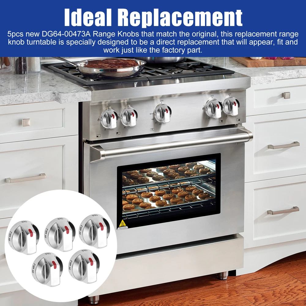 DG64-00473A Top Burner Control Dial Knob Range Oven Replacement Stainless Steel Compatible with Samsung Range Oven Gas Stove Knob NX58F5700WS NX58H5600SS NX58H5650WS NX58J7750SS NX58M6850SS (5pcs) Ideal Replacement:5 new DG64-00473A Stove Knobs that matches the original, for far less than going back to the dealership. This replacement Range Knob Dial was specifically designed to look and function the same as the original Burner Knob Dial on Samsung Range Oven. While this is NOT a genuine Samsung part, it is a direct replacement and it will appear, fit and work like the factory part. Upgraded:Strong rings to reinforce around the middle part of the knobs - kinda like a tight sleeve around them to ensure they can take heavy duty and won't be cracked easily. No tool required - Easily install the part YOURSELF and quickly get your range oven burner back to work within few minutes. Replaces Part Number And Appliance Model:Replaces Part Number: DG64-00473A, DG64-00473B, 3447565, AP5917439, PS9606608, B01GV9ZRM4, EAP9606608. Fit for Samsung Range Oven NX58H5600SS, NX58H5650WS, NX58J7750SS, NX58M6850SS, NX58K7850SS Gas Range - If your stove is black, you will need DG64-00473B instead and this knob won't match your color. Fits with various Samsung brand models including but not limited to Samsung NX58F5700WS/AA-03 Range · Samsung NX58H5600SS/AA-00 Gas Range Samsung NX58H5600SS/AA-01 Gas Range · Samsung NX58H5600SS/AA-02 5.8 Cu. Ft. Self-Cleanin Gas Convection Range Samsung NX58H5600SS/AA-03 5.8 Cu. Ft. Self-Cleanin Gas Convection Range Samsung NX58H5600SS/AC-01 5.8 Cu. Ft. Self-Cleaning Freestanding Gas Convection Range Samsung NX58H5600SS/AC-02 5.8 Cu. Ft. Self-Cleaning Freestanding Gas Convection Range Samsung NX58H5650WS/AA-00 Gas Range · Samsung NX58H5650WS/AA-01 Gas Range Samsung NX58H5650WS/AA-02 Gas Range · Samsung NX58J7750SS/AA-00 Gas Range Samsung NX58J7750SS/AA-01 Gas Range · Samsung NX58J7750SS/AC Gas Oven,5.8,Real Stainless Samsung NX58K7850SS/AA-00 Gas Range Samsung NX58K7850SS/AA-01 5.8 Cu. Ft. Flex Duo With Dual Door Freestanding Gas Range Samsung NX58K7850SS/AA-02 5.8 Cu. Ft. Flex Duo With Dual Door Freestanding Gas Range Samsung NX58M6850SS/AA-00 Gas Range Samsung NX58M6850SS/AA-01 5.8 Cu. Ft. Flex Duo Freestanding Gas Range Product Introduction Size: 2.4 inch/ 6.09 cm in diameter, 1.5 inch/ 3.81 cm in height Condition: 100% Brand New and never used Package Includes: 5 x DG64-00473A Gas Range Knob Function: Burner Control/Cooktop/Stove/Oven Knobs