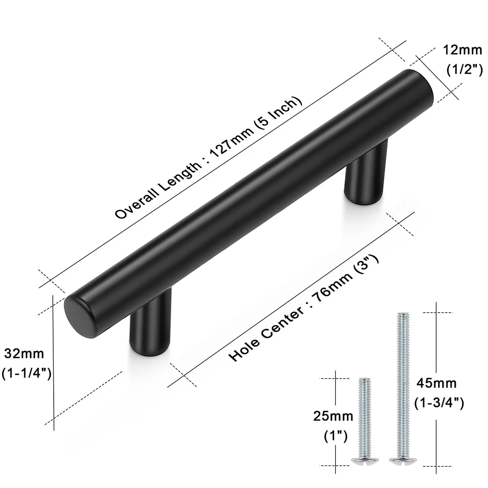 [Durable]: The pull body is hollow,but very sturdy after installation, it is nice and practical. Will be additional value of cabinet. [Measurement]: Hole Centers(CC):76mm(3 inch), Overall Length:127mm(5 inch), Diameter:12mm, Projection:32mm(1-1/4 inch) [Modern cabinet handles]: Suitable for different styles of cabinets, wardrobe, chest and cupboard. [Screws]: Comes with M4*25mm & M4*45mm screws, will fit most standard cabinet board thickness. [Lifetime Warranty]: If any problem occurs in the product, please conctat us,we will send you a replacement absolutely free, no return required.