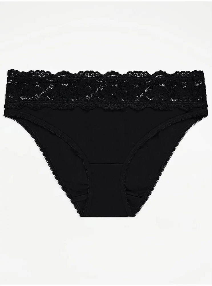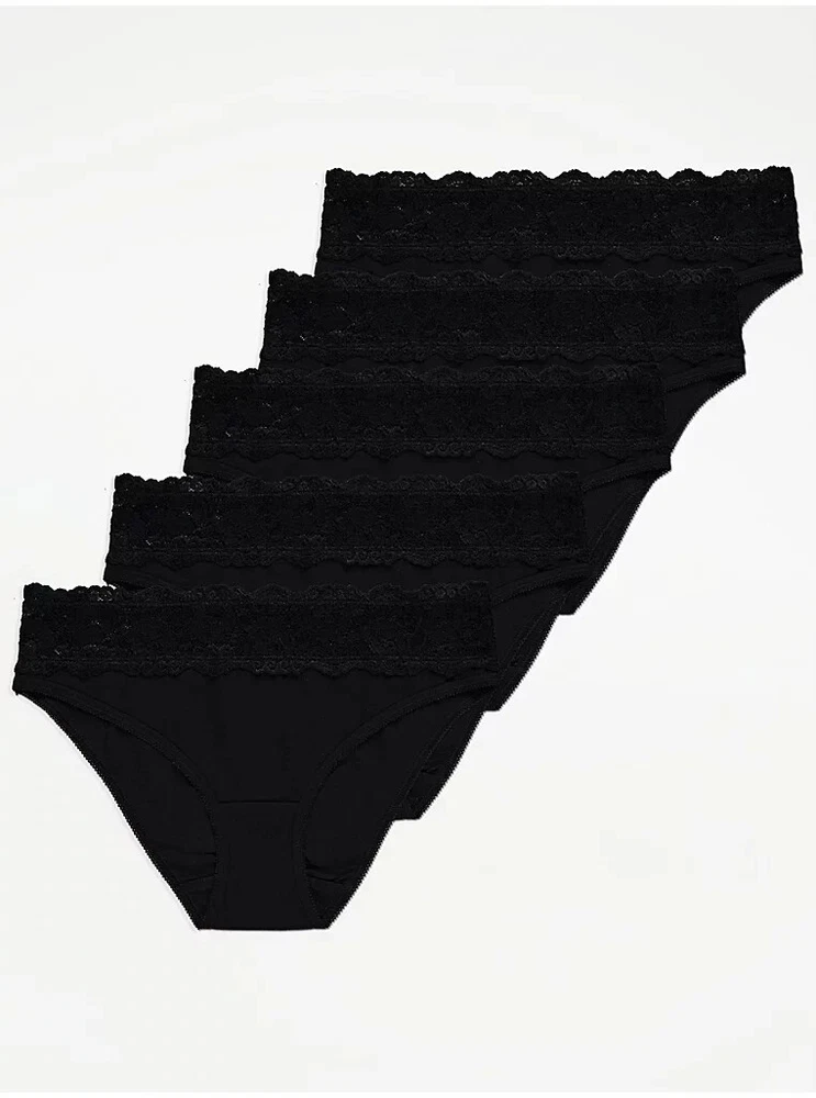 Black Lace Trim High Leg Knickers 5 Pack ALL SIZES AVAILABLE 18, 20,22,24 UK please message me the size you want- Thanks VALUE FOR MONEY 5 PACK HIGH LEG BLACK LACE KNICKERS EVERYDAY STYLISH WEAR FEELS CONFIDENT AND COMFORTABLE MACHINE WASHABLE 95% Cotton 5% Elastane THANKS FOR LOOKING
