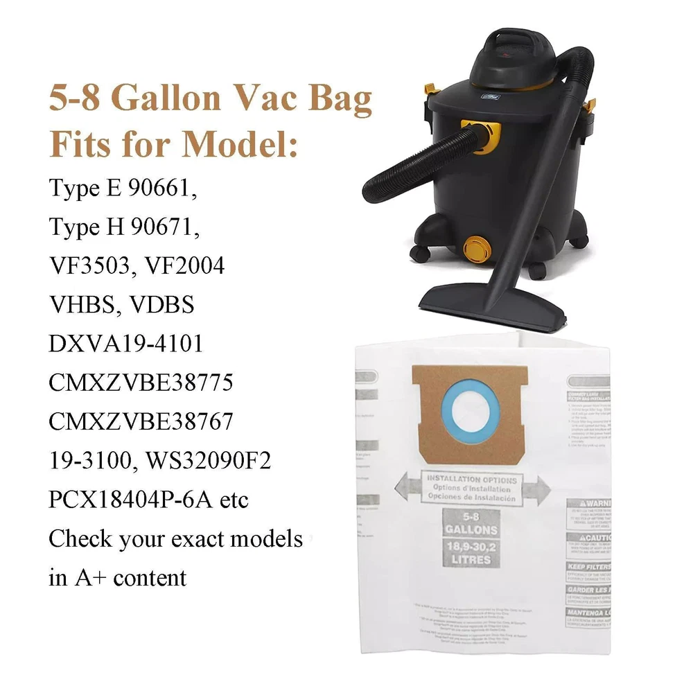Product Description Features: 1. Please Verify This Is The Right Part Number Before Ordering 2. Use Quality Materials, 100% Tested Before Shipping 3. Easy Install And Convenient To Use 4. Great Quality, Direct Replacement  Specifications: Type: Vacuum Cleaner Dust Bags Condition: 100% New Material: Paper  Fitment: For Shop Vac 5-8 Gallon Vacuum Type E 90661, 9066100, 9066108, 9066111, 9066127, 9066133; For Shop Vac 5-8 Gallon Vacuum Type H 90671 9067100 9067133 For Shop Vac 5-8 Gallon Vacuum Type U 90304 For Vacmater VHBS VDBS For Craftsman CMXZVBE38775, CMXZVBE38767 For Ridgid VF3503, VF2004 For Porter-Cable PCX18404P-6A  Packaging Includes: 5* Vacuum Cleaner Dust Bags Shipping Returns Contact Us Payment 1. Items sent from US warehouse. 2. Receiving time = Processing time + Shipping time. 3. Pro cessing Time: Around 1-2 business Days. 4. Shipping Time: 3-5 business day. it may have a little delay during some holiday (such as Christmas), any problem, please feel free to contact. 1. 30 days warranty from the purchased date. Please contact us via email before returning the defective item. 2. Our warranty does not extended to any product that are physically damaged or that are not under normal operating conditions as result of misuse or improper installation on the buyer/user's part. 3. Return items should include the original packaging and all accessories. buyers MUST contact us for the returning address. 4. In all cases, buyers pay shipping fees at their own cost to return products for exchange or refund. We will be responsible for the postage of replacements. Refund will be made upon receipt of the returned item. If you have any question, please e-mail us immediately, we will reply you as quickly as possible. We care about our valued customers, and will always try to help you. We accept all verified payment from eBay. Shipping 1. Items sent from US warehouse. 2. Receiving time = Processing time + Shipping time. 3. Pro cessing Time: Around 1-2 business Days. 4. Shipping Time: 3-5 business day. it may have a little delay during some holiday (such as Christmas), any problem, please feel free to contact. Returns 1. 30 days warranty from the purchased date. Please contact us via email before returning the defective item. 2. Our warranty does not extended to any product that are physically damaged or that are not under normal operating conditions as result of misuse or improper installation on the buyer/user's part. 3. Return items should include the original packaging and all accessories. buyers MUST contact us for the returning address. 4. In all cases, buyers pay shipping fees at their own cost to return products for exchange or refund. We will be responsible for the postage of replacements. Refund will be made upon receipt of the returned item. Contact Us If you have any question, please e-mail us immediately, we will reply you as quickly as possible. We care about our valued customers, and will always try to help you. Payment We accept all verified payment from eBay. You may also like 5/16" Line Fuel Filter Replace Part For Mercury For Quicksilver Marine Engine 12.33 USD Housing Case Kit 5-Cell 18650 Replace For DeWalt 20V DCB201/203 Li-Ion Battery 17.63 USD 1.99 USD Wireless Remote Control DC 6V 12V 24V 2CH RF Relay Transmitter 433MHz Universal 15.06 USD New Laser Lens Deck Repair Part For Sony PlayStation 2 PS2 Slim PVR-802W 20.67 USD Gas Fireplace Thermocouple Universal Stove Thermocouple 600mm Grill Fireplace 11.89 USD Hi-Speed USB Port Socket Connector Without Wings For Xbox Series S Console 11.65 USD powered by