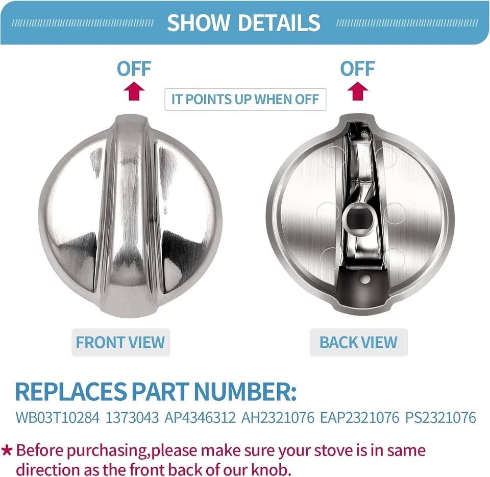 PREMIUM QUALITY: These knobs are made from durable high quality material and finished with stainless steel finish to ensure LONG-LASTING and effective performance. Ideal Replacement: Want new stove knobs that match the original? These replacement GE Electric range knobs was specifically designed to look and function the same as the original GE Range knobs on your cooktop. it is a direct replacement and it will appear, fit and work like the factory part. Replacement Compatible with General Electric Hotpoint RCA Plastic Top Burner Surface Knob (with Stainless Steel Finish) Replaces commonly broken or worn burner knob Replacement surface burner knob compatible with General Electric/Hotpoint/RCA/Kenmore replaces part numbers WB03T10284, AP4346312, 1373043, AH2321076, EA2321076 and PS2321076 On Jan 8, 2026 at 19:59:15 PST, seller added the following information: