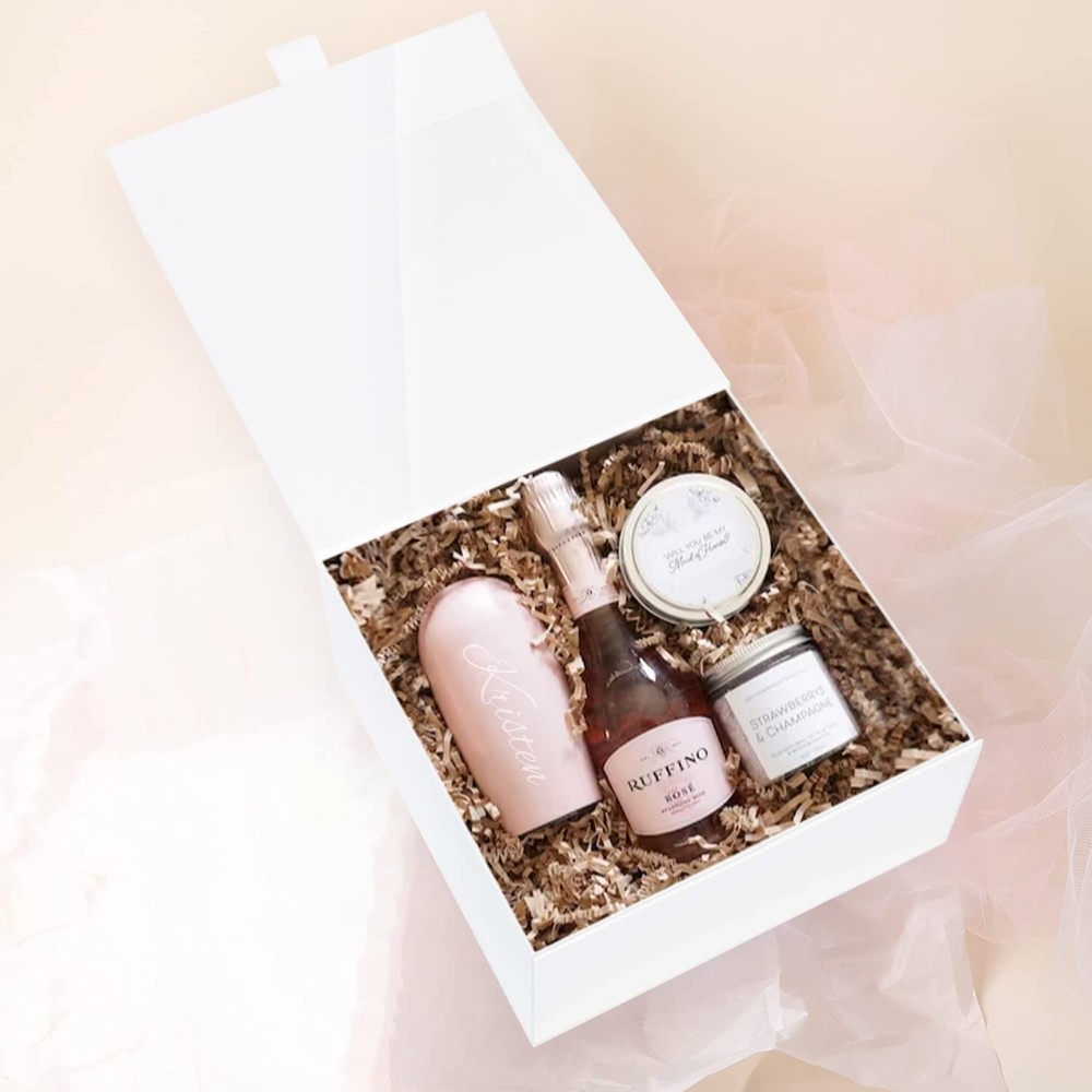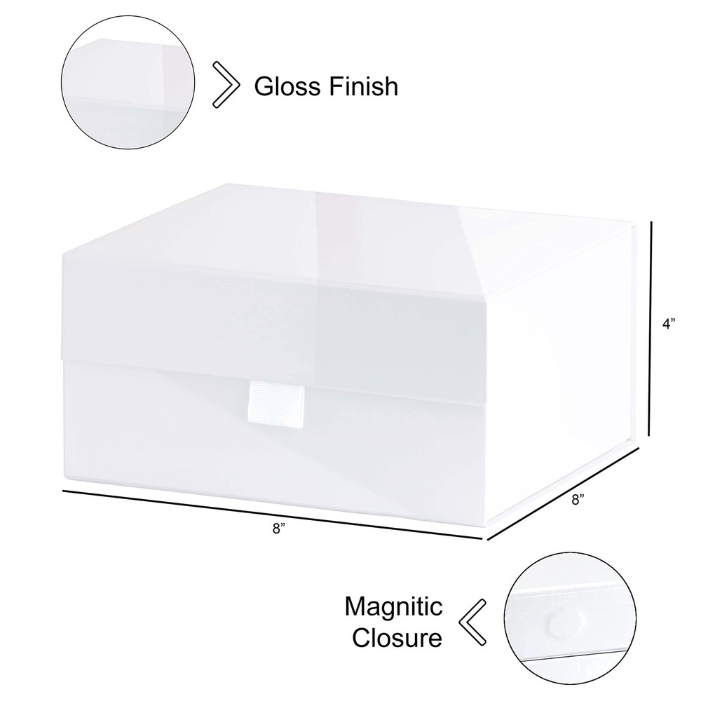 A white gift box gives that clean design and cutting edge. It’s the perfect balance to compliment your items inside. We love this gift box because it does so much more than provide usage. It’s just the finishing touch, representing modern sophistication. Whether you're thinking hostess gift, a gift box…. whatever the need or occasion you're covered. What better way to be covered than with class? Happy giving! MAGNETIC CLOSURE: This box comes with a strong built in magnetic seal which will keep the box closed. EASY TO ASSEMBLE: This box is shipped flat and assembles in seconds, just lift the sides up, remove the white strip and press the self-seal to seal. Super simple and super clean! GLOSSY WHITE FINISH: This beautiful glossy white gift box will wow your recipient and take your gift giving to the next level! SIZE AND QUANTITY: The boxes measures 8x8x4 inches, and comes with 5 boxes. USE: Our box is the perfect box for bridal shower gifts, birthday gifts, hostess gifts and more! They are also a great gift box for presents, baby gifts, you name it! This product is not suitable for children aged 13 and under.