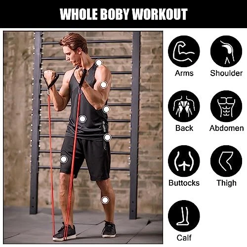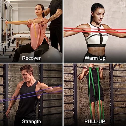 Description Resistance Loop Band Kit has11 colored loop bands of different power levels. You can use not only the bands but also the bands together with door anchor, handles, dumbbells or barbells for effective workouts. The bands are men and women learning pull ups, chin ups, ring dips and muscle ups. It is lightweight and takes little space in your bag. You can take it with you and do workouts everywhere you go! Feature 5 loop bands of different levels Different colors indicate different power levels Multi-ways of workouts Made of heavy-duty material to avoid easy breakage or tearing and for longer using Lightweight and takes little space Comes with a storage bag for easy carrying Fits anyone, men and women in different ages You can isolate and target glutes, legs, hips & knees Perfect assist bands for men and women learning pull ups, chin ups, ring dips and muscle ups Package 1 pack 5in1: 5 Resistance loop bands; 2 Handles; 1 Door anchor; 1 Carry bag **LB/1pcs: 1resistance band 1 pack 4in1: 4 Resistance bands 술 술 술 술 술 술 5 Different Power Level Bands: 5 different colors and clear weight indications are for 5 different power levels: yellow 5-15LB, red 15-35LB, black 25-65LB, purple 35-85LB, green 55-125LB. You can use only 1 band or 2 different bands at one time to get the power level you want while doing pull-ups or daily workout. GYM Assistance & Daily Workout: This resistance gym band kit is not only perfect for GYM assistance, like pull-ups, power lifting, push-ups, barbell assist and dumbbell assist; but also the best choice for daily workout. Super-Portable with Free eBook: This resistance band set comes with a storage bag, light weight and takes little space in your bag. Detail free eBook can be down to your mobile phone, doing exercise in anytime! You can take it at home, to gym, office or take it on your trip. With it you can do resistance band workouts wherever you go! Multi-Ways for Workouts: You can do workout using only one assist band or two different bands. Besides, you can do resistance band workouts using 1 band with door anchor, with 2 handles, with 1 anchor and 2 handles, with dumbbells, or with barbells. Just choose the way that fits you the best. High-Plastic and Durable: All resistance bands from are made of heavy-duty material so as to avoid easy breakage or tearing. They are high-plastic and can be used for a longer time than other products in the market.