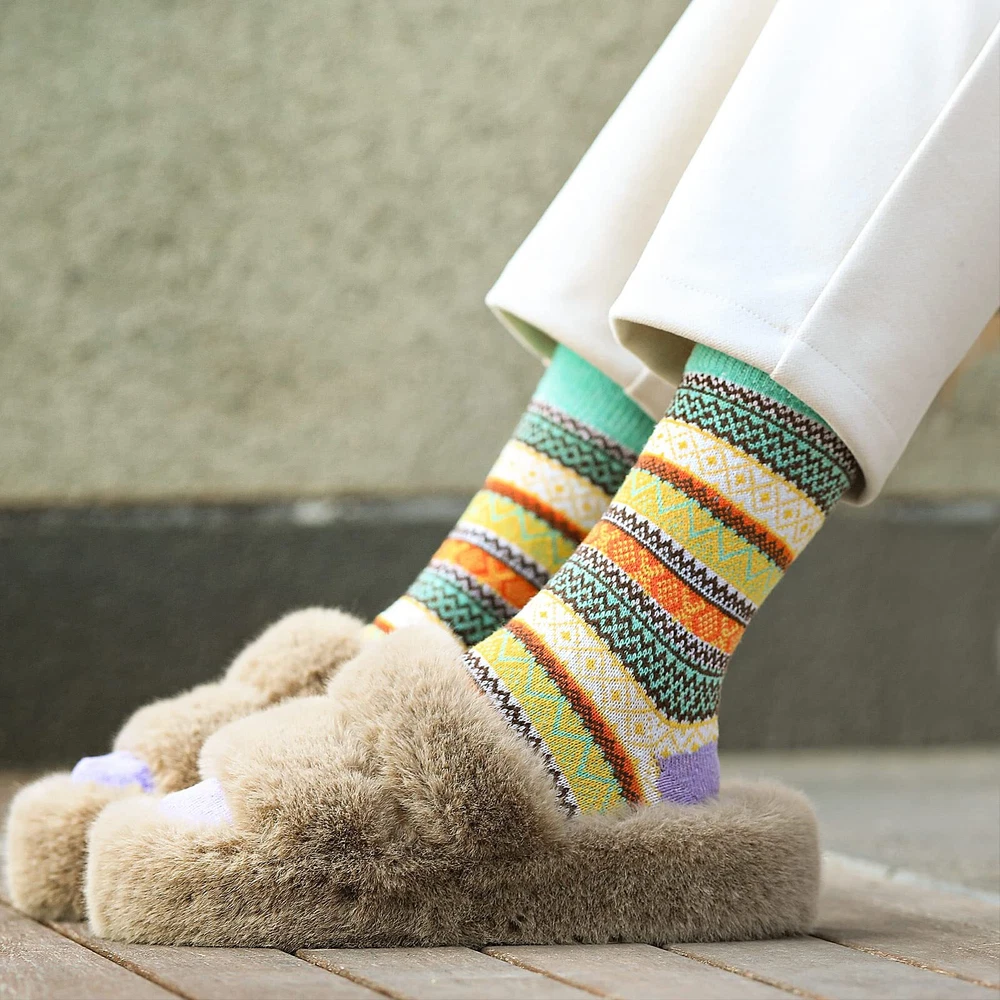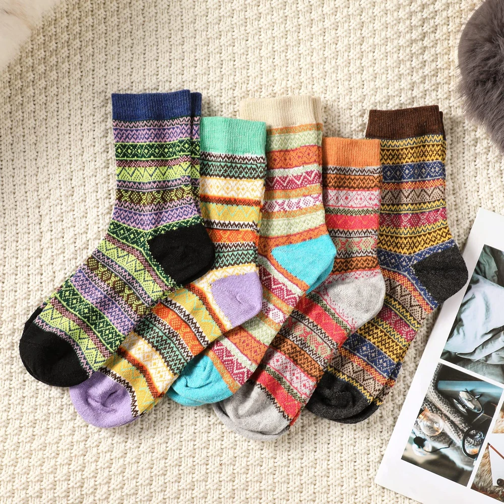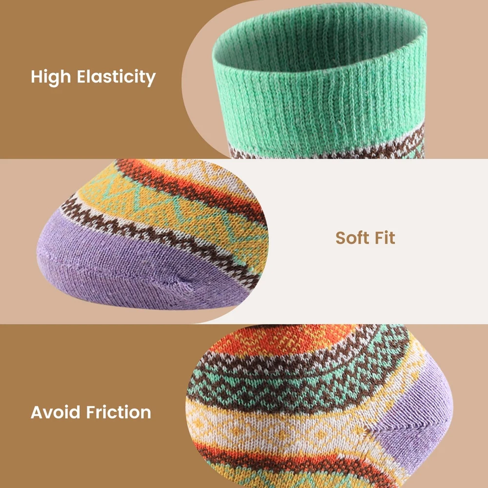 Description Wool Socks - Wool Socks for Women, Womens Wool Socks, Warm Socks for Women Men, Thick Winter Socks Cozy Socks Premium Women Wool Socks - Our wool socks for women are made out of premium soft wool, polyester and spandex, which keep your feet warm and comfortable with a cozy skin-friendly experience. Warm Socks One Size Fits Most - Our winter socks for women are suitable for women US shoe size 5-9. The thick knit wool socks are super elastic and soft, keep your feet warm without any tightness. Warm Wool Socks - These well-made warm socks for women are cozy, soft and durable. Seamless stitching, elastic cuff, soft breathable material also make them suitable for sleeping socks, keep your feet warm in cold night. These boot socks for women are suitable for many occasions, such as hiking, walking, or other outdoor activities. 5 Pairs Vintage Fashion Women Socks - Each pack of the winter wool socks includes 5 different Vintage bright colors. Classic vintage design women socks, easily coordinate with whatever you're wearing. Light up your winter morning with these colorful wool socks. Perfect Crew Socks Gifts - Nobody will reject these high-quality women wool socks in cold weather. This womens winter socks will be perfect socks gift for your mom, girlfriend, daughter, wife, as birthdays, Christmas, thanksgiving gift to show your love and care.