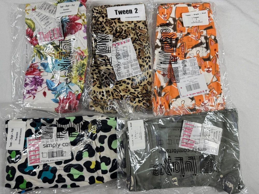 New in Bag With Tag 5 Pair of Tween LuLaRoe Leggings Tween fits Kids Size 00-0 I will combine shipping on your items as long as its with 48hrs of your 1st item ending. Anything after 48hs will be a separate invoice. After 4 days of non payment your item will be Canceled
