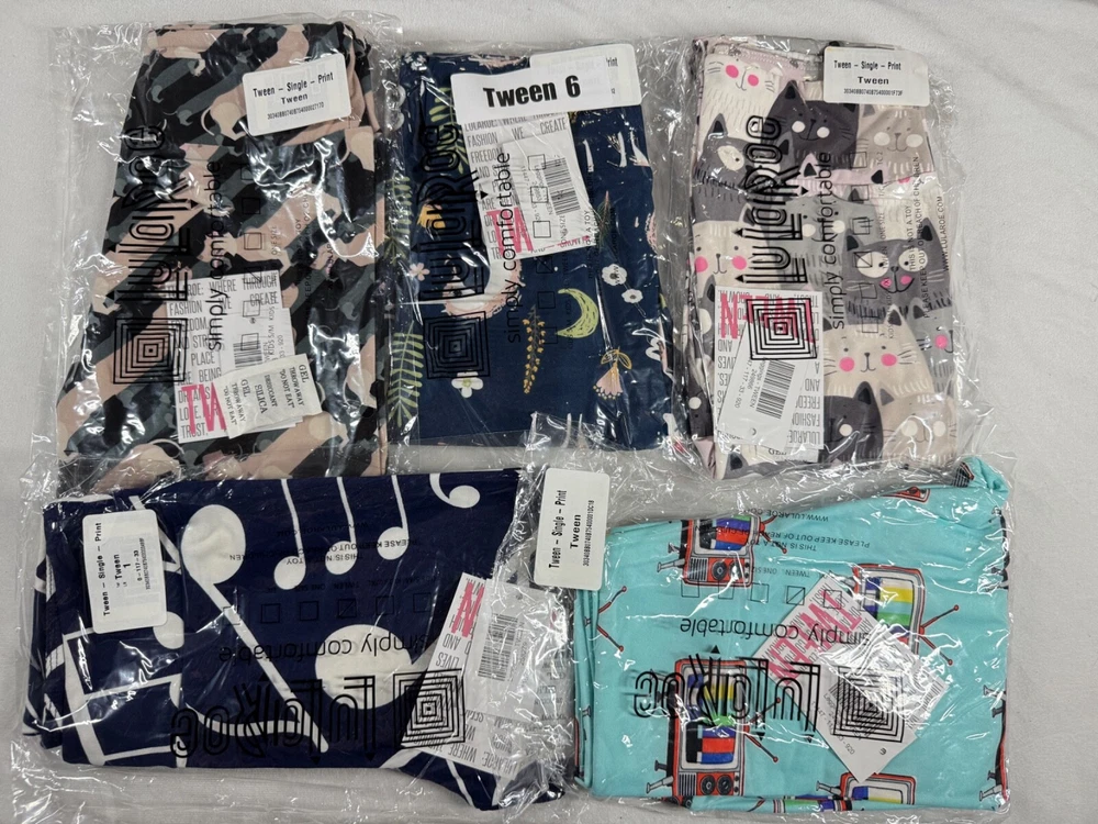 New in Bag With Tag 5 Pair of Tween LuLaRoe Leggings Tween fits Kids Size 00-0 I will combine shipping on your items as long as its with 48hrs of your 1st item ending. Anything after 48hs will be a separate invoice. After 4 days of non payment your item will be Canceled