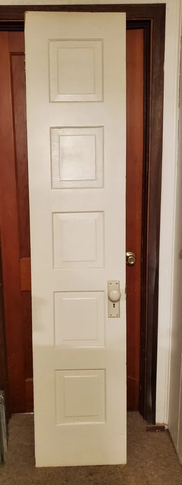 This door is a special 7 foot tall 17 7/8" wide and actual 1 Inch thick. Solid wood. FROM A home over 105 years old. This appears to be original. 5 panel and 1 of 1 if you've shopped these. With original door knobs skeleton key hole (no key). Panels measure around 9 3/4" h x 10 3/4" wide.........34" from bottom of the door to door knob center and 2 3/8" to center of knob. Originally a left hand swing but can be altered by most craftsman. Door knobs will be shipped off along with any hardware sticking out to minimize damage. Enjoythis! ......................................................................SHIPPING TIME: That day label and shipped depending on weekend or holiday hours. Could arrive in 1 week and 2 weeks latest depending on shipper. Sold asis good quality door painted white